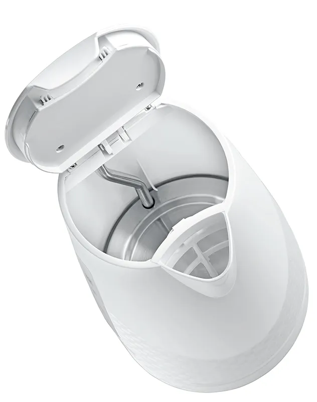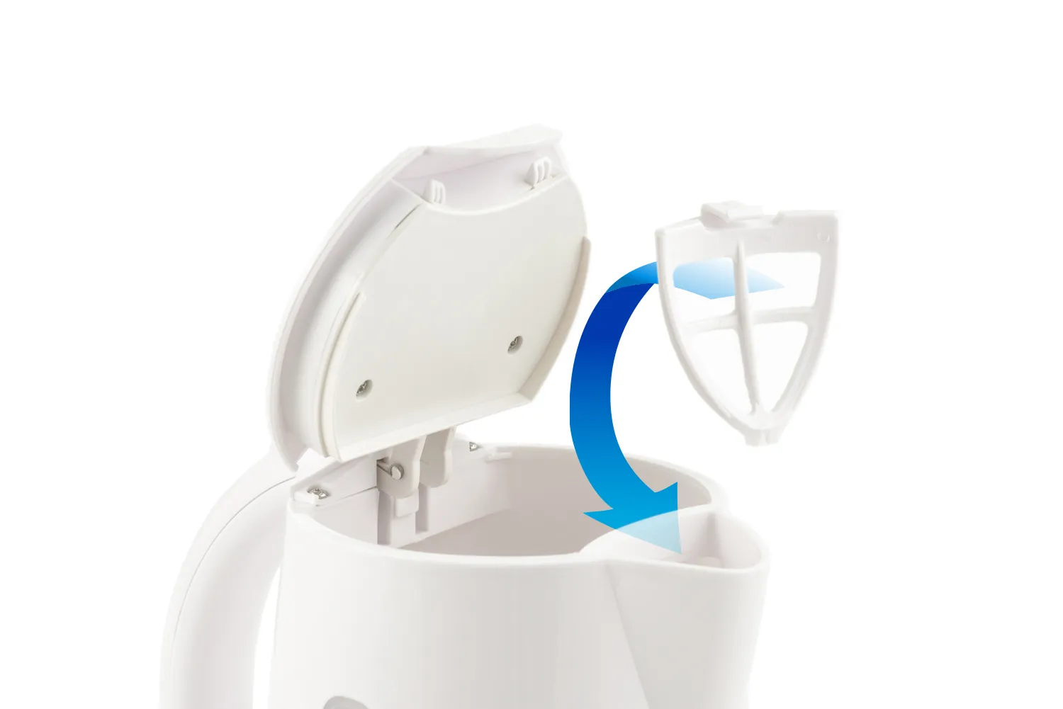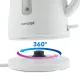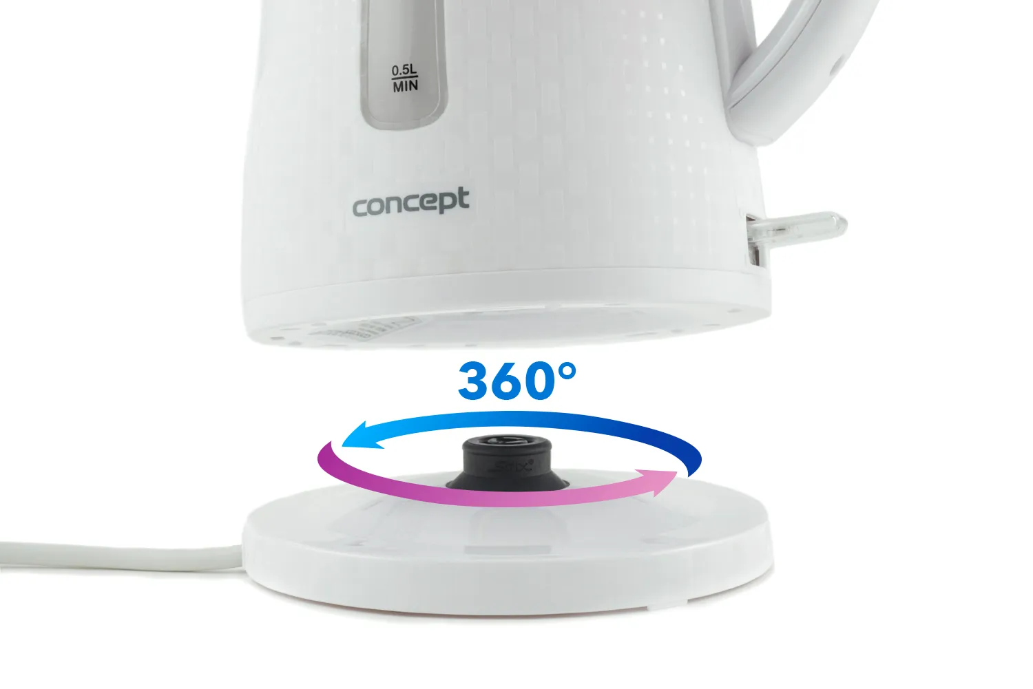 Široké tělo konvice, skryté topné těleso a vyjímatelné sítko proti vodnímu kameni umožňují snadné čištění. Výhodou je otočný podstavec o 360 st., takže nemusíte řešit, z jakého úhlu konvici na podstavec umístíte.