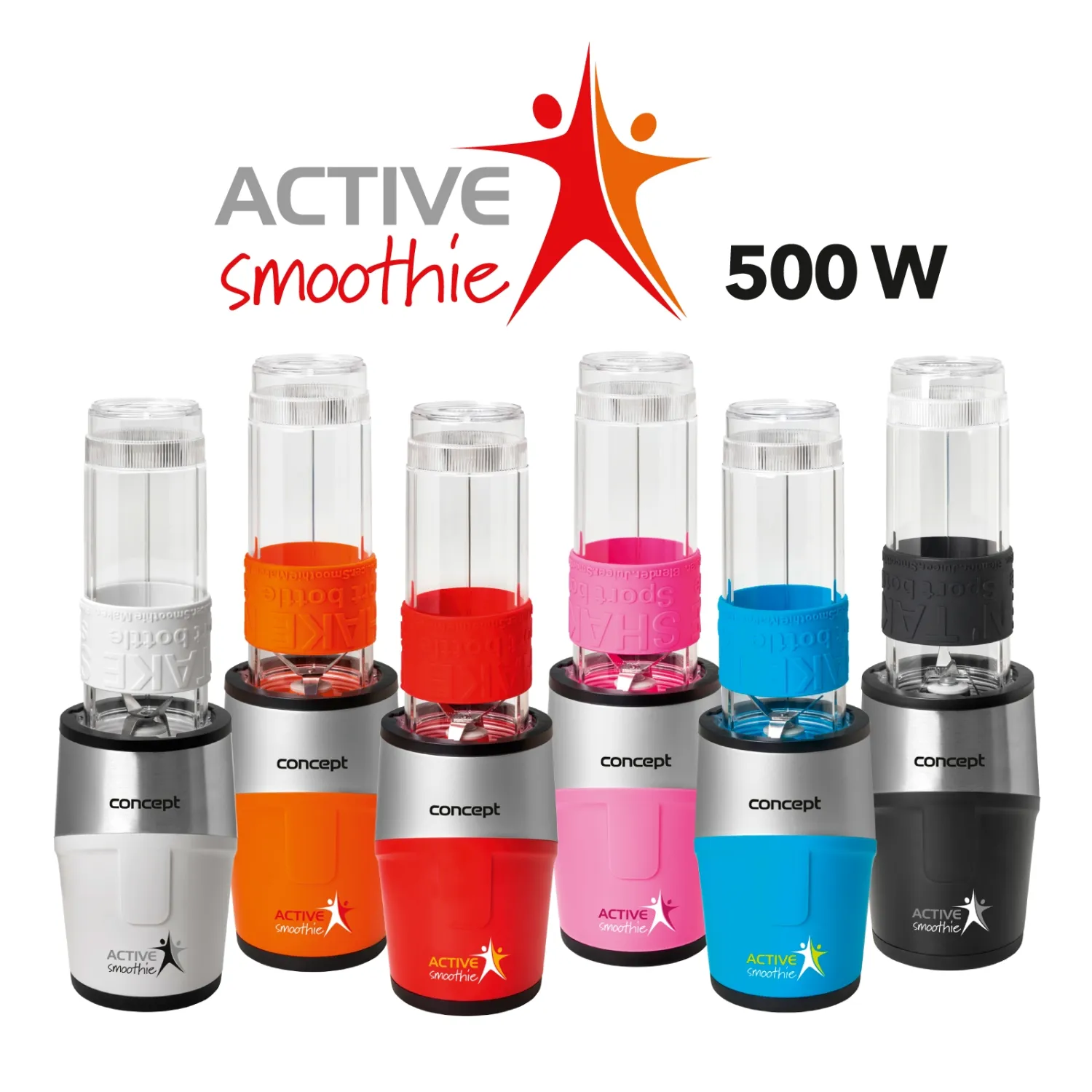 Smoothie maker ACTIVE SMOOTHIE Concept SM3380 s příkonem 500 W umixuje díky své síle jemné a sametové smoothie. V základní výbavě najdete černou a bílou láhev o objemu 570 ml a menší, 400 ml. Smoothie maker i láhve můžete vybírat z 6 barevných variant.