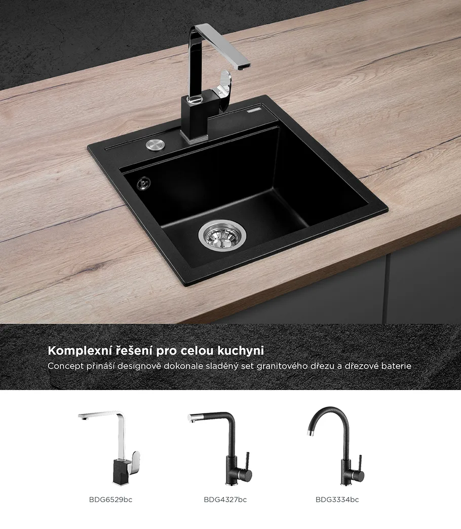 Atraktivní vzhled, kvalitní zpracování, vysoká odolnost a snadná údržba, to jsou hlavní přednosti granitových dřezů Concept. Perfektně zapadnou do každé kuchyně a v kombinaci s bateriemi Concept tvoří dokonale sladěný celek. Model DG00C50bc je součástí designové řady CUBIS, kterou spojují moderní hranaté linie a v kuchyni působí velmi nadčasovým a elegantním dojmem.