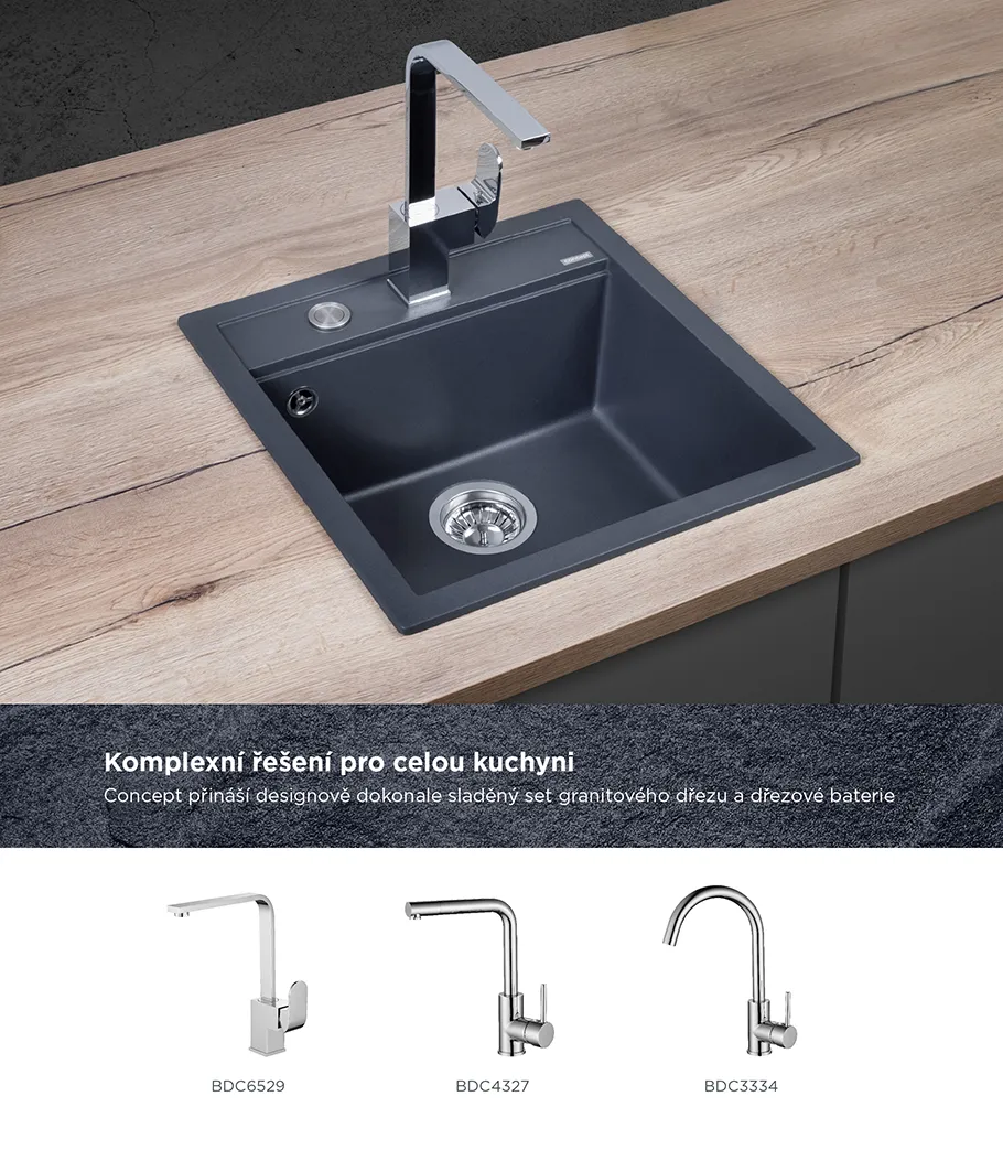 Atraktivní vzhled, kvalitní zpracování, vysoká odolnost a snadná údržba, to jsou hlavní přednosti granitových dřezů Concept. Perfektně zapadnou do každé kuchyně a v kombinaci s bateriemi Concept tvoří dokonale sladěný celek. Model DG00C50dg je součástí designové řady CUBIS, kterou spojují moderní hranaté linie a v kuchyni působí velmi nadčasovým a elegantním dojmem.