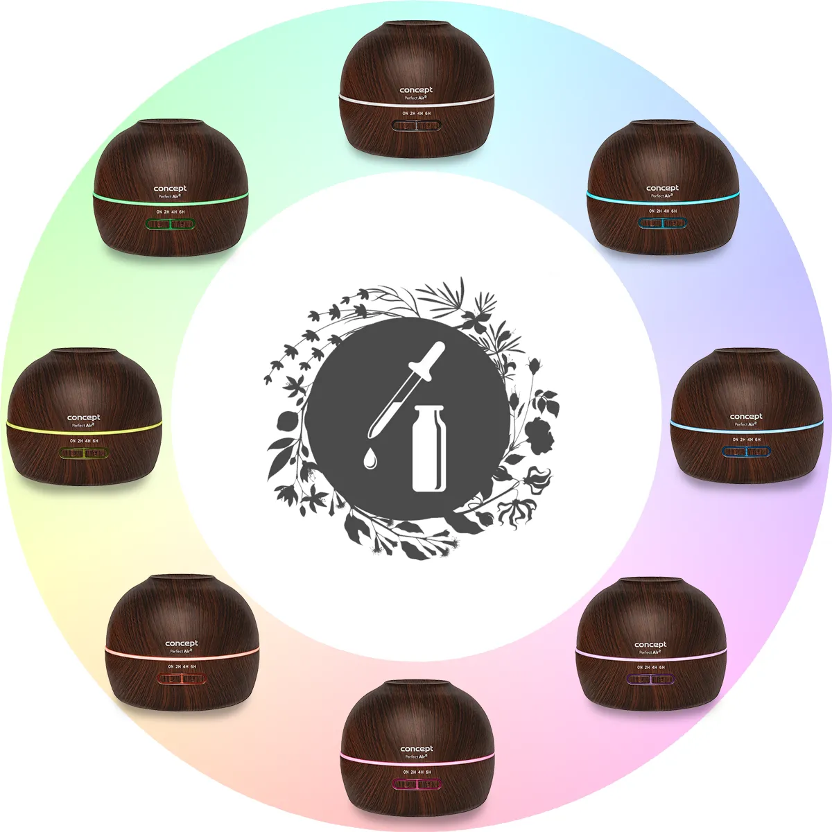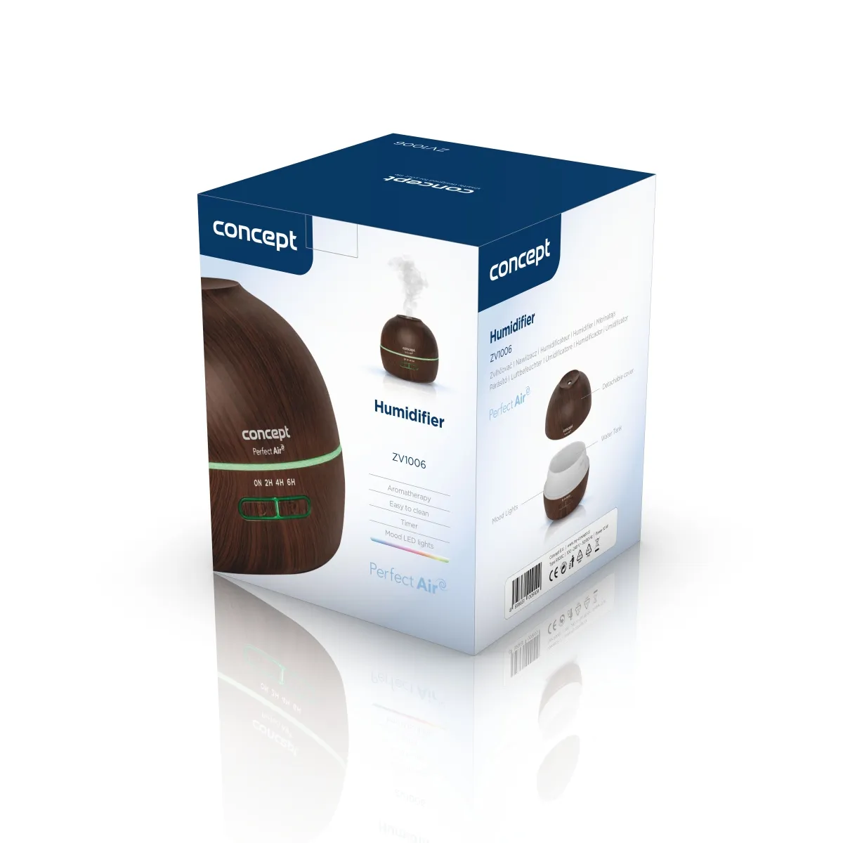 Zvlhčovač vzduchu ZV1006 z řady Perfect Air je spojením zvlhčovače a aroma difuzéru. Vyniká moderním designem tmavého dřeva doplněným o barevné ambientní podsvícení. Je vhodný do místností o velikosti až 20 m² a nabízí 2 režimy s maximální výkonem 40 ml/h. Díky svému kompaktnímu rozměru zapadne do každé domácnosti. Disponuje zásobníkem na vodu s objemem 300 ml, který dokáže vytvářet jemnou páru po dobu až 12 h. Při nedostatku vody se přístroj automaticky vypne.