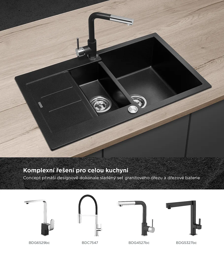 Atraktivní vzhled, kvalitní zpracování, vysoká odolnost a snadná údržba, to jsou hlavní přednosti granitových dřezů Concept. Perfektně zapadnou do každé kuchyně a v kombinaci s bateriemi Concept tvoří dokonale sladěný celek. Model DG205C60bc je součástí designové řady CUBIS, kterou spojují moderní hranaté linie a v kuchyni působí velmi nadčasovým a elegantním dojmem.