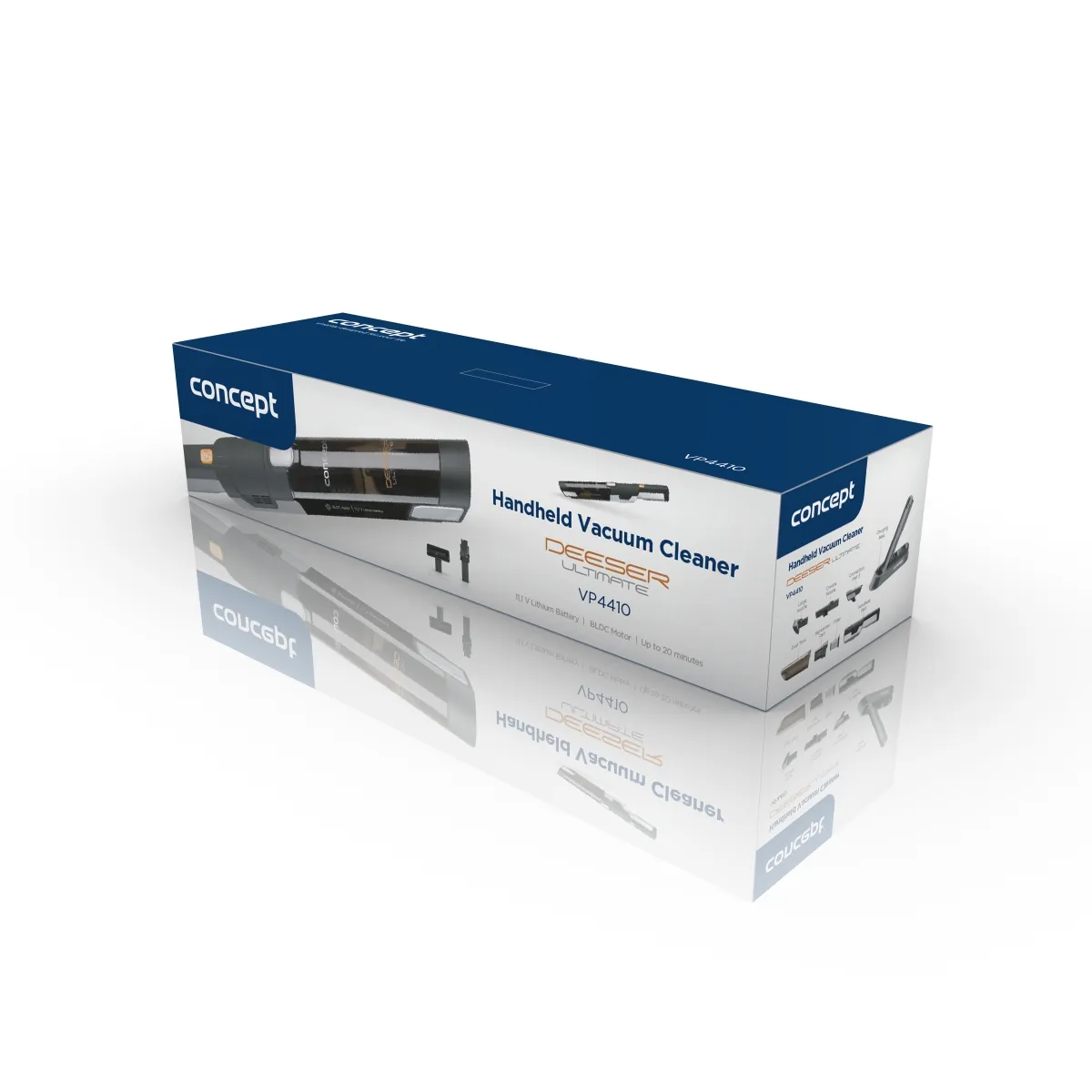 Ruční vysavač VP4410 Deeser ultimate je kombinací elegantního designu a špičkového sacího výkonu, na kterém má zásluhu bezkartáčový BLDC motor. Kompaktní a ultra lehké tělo nabízí pohodlnou obsluhu pro váš každodenní drobný úklid v domácnosti i v autě. Díky kvalitní Li-Ion baterii 11,1 V s kapacitou 2200 mAh zvládnete uklízet až 20 minut na jedno nabití, a navíc vás při práci neobtěžuje žádný kabel.
