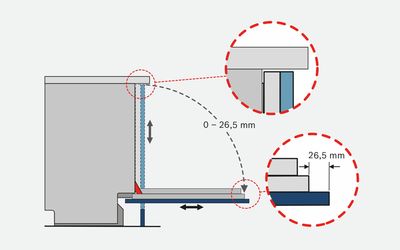 Doposud byly plně integrované myčky stavěny tak, že byly přimontovány k horní desce a mezi čelními panely skříněk zůstávaly mezery. To už je minulostí. Díky systému VarioHinge už nemusíte dělat kompromisy. Při otevírání spotřebiče je plně integrovaný čelní panel skříňky lehce stlačen směrem nahoru. Počítá se s malými, pravidelnými spárami v horní části skříňky.