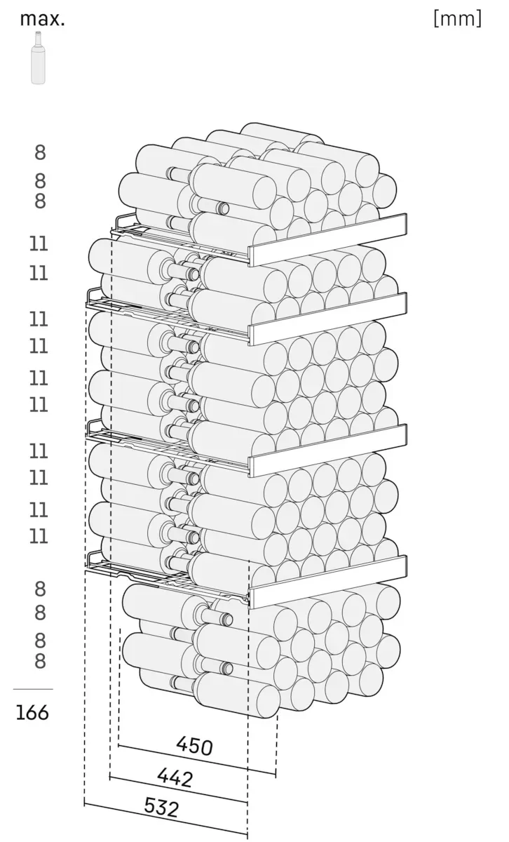 Promyšlené a propracované. Elegantní police vyrobené z bukového dřeva jsou navrženy pro vodorovné uložení vín bez působení vibrací a díky ergonomickému tvaru lze láhve snadno zasouvat, vytahovat i přeskládat. Další výhodou je skutečnost, že dřevo dýchá a dokáže uložit menší množství vody, což je dobré pro mikroklima uvnitř a tedy i pro dlouhodobé skladování.