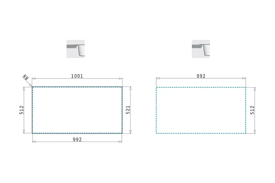Horní nástavná montáž - 3 strany s ohybem dolůTři ze čtyř hran mají ohyb směrem dolů a čtvrtá, která je zadní hranou dřezu, je zakřivená nahoru, aby vytvořila rám přiléhající ke stěně.