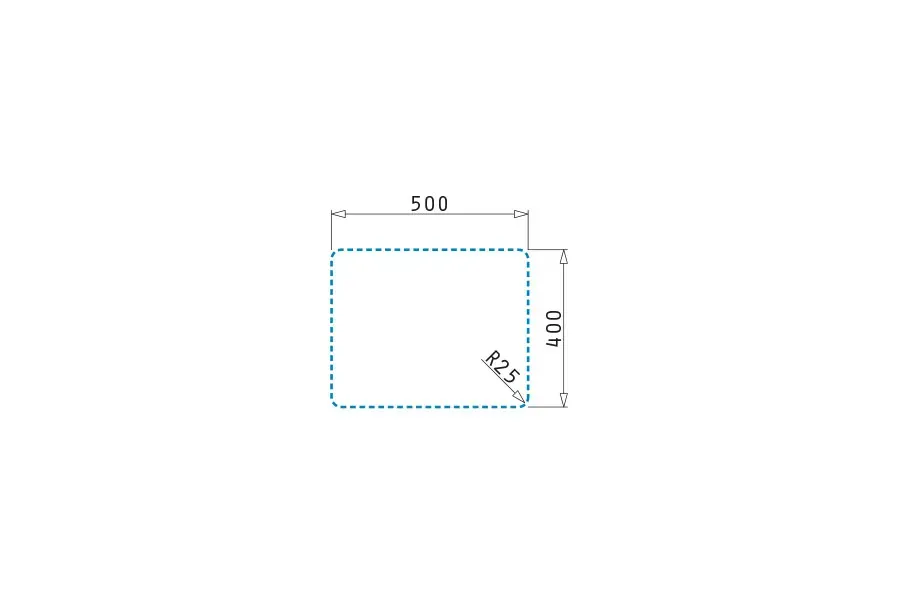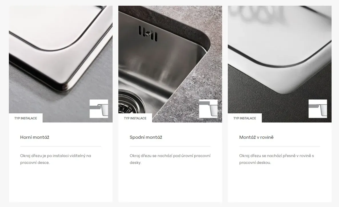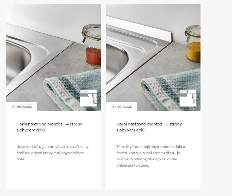 Horní nástavná montáž - 3 strany s ohybem dolůTři ze čtyř hran mají ohyb směrem dolů a čtvrtá, která je zadní hranou dřezu, je zakřivená nahoru, aby vytvořila rám přiléhající ke stěně.