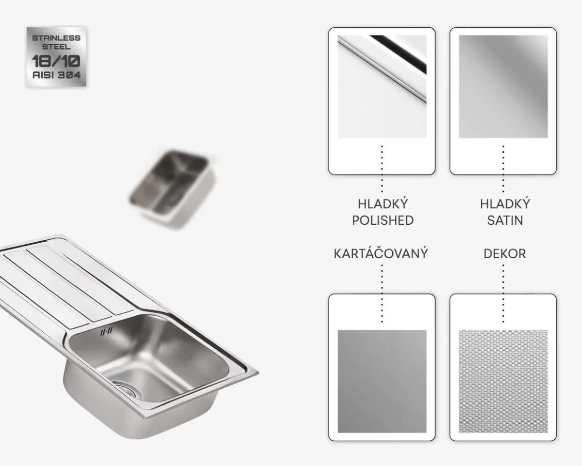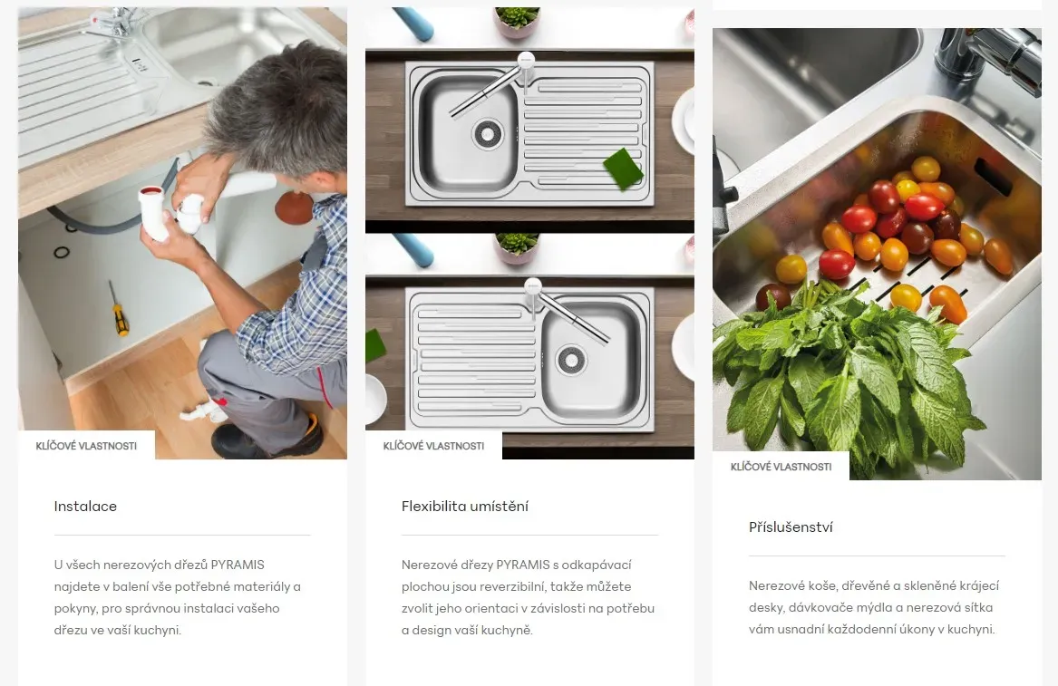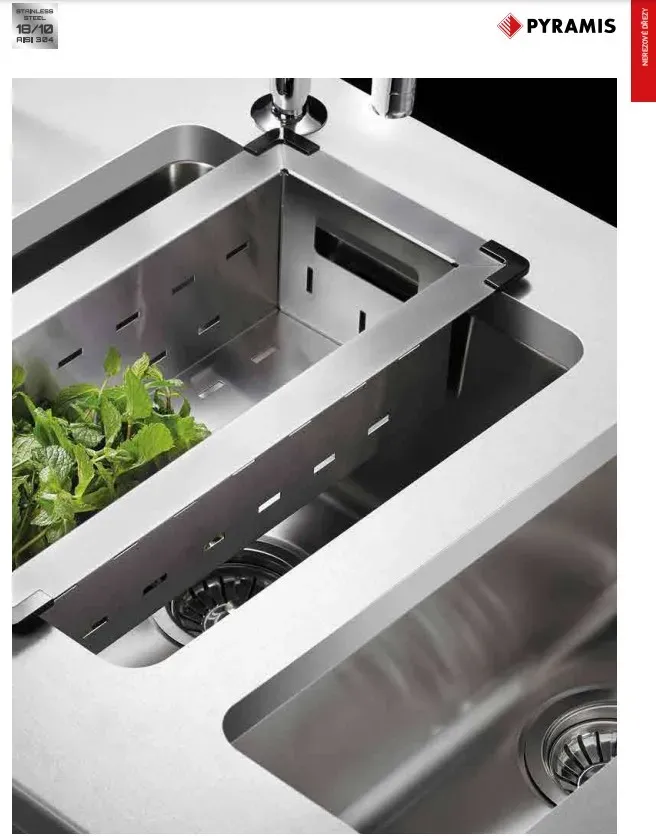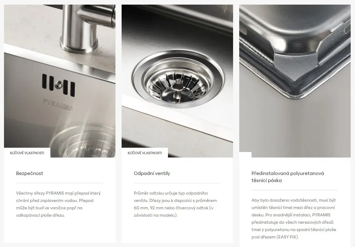 BezpečnostVšechny dřezy PYRAMIS mají přepad který chrání před zaplavením vodou. Přepad může být buď ve vaničce popř na odkapávací ploše dřezu.