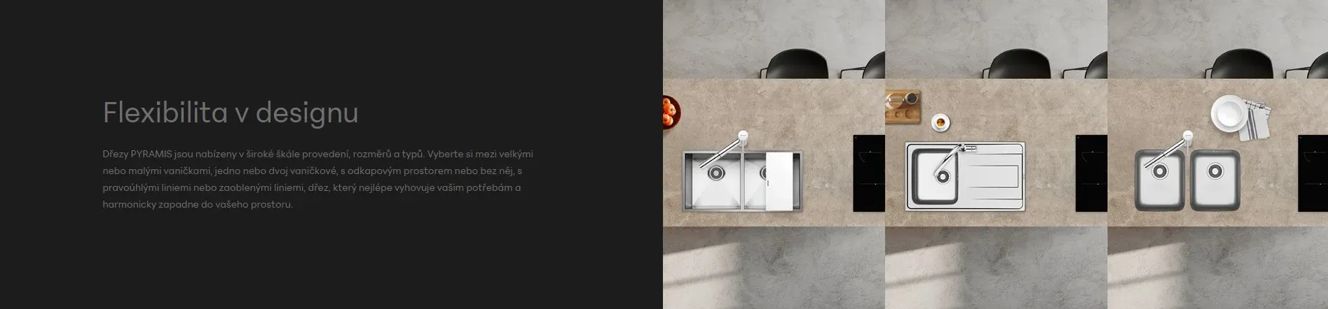 Flexibilita umístěníNerezové dřezy PYRAMIS s odkapávací plochou jsou reverzibilní, takže můžete zvolit jeho orientaci v závislosti na potřebu a design vaší kuchyně.