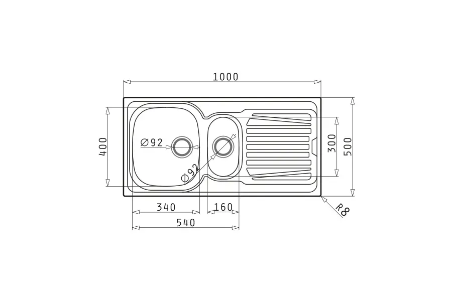 Odpadní ventilyPrůměr odtoku určuje typ odpadního ventilu. Dřezy jsou k dispozici s průměrem 60 mm, 92 mm nebo čtvercový odtok (v závislosti na modelu).