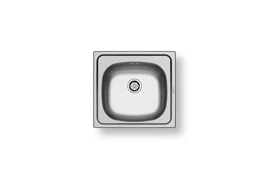 Horní nástavná montáž - 3 strany s ohybem dolůTři ze čtyř hran mají ohyb směrem dolů a čtvrtá, která je zadní hranou dřezu, je zakřivená nahoru, aby vytvořila rám přiléhající ke stěně.