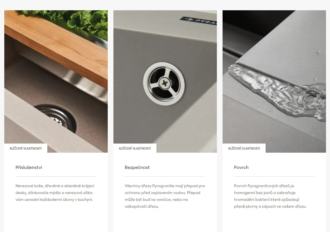 VlastnostiPyragranitové dřezy se nezbarvují ani pokud přijdou do styku s chemickými domácími čističi. Vykazují vysokou tepelnou odolnost (200°C), nárazovou odolnost a trvanlivost odolnost a trvanlivost.