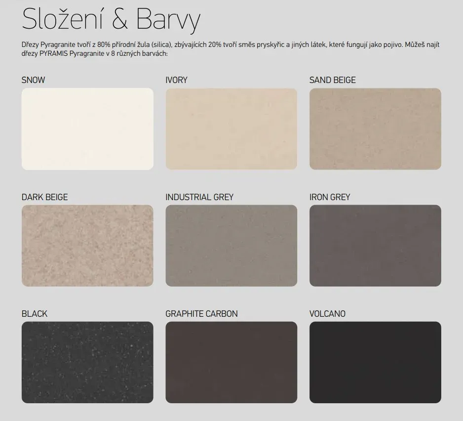 Dřezy Pyragranite tvoří z 80% přírodní žula (silica), zbývajících 20% tvoří směs pryskyřic a jiných látek, které fungují jako pojivo. Můžeš najít dřezy PYRAMIS Pyragranite v 8 různých barvách: Snow, Graphite Carbon, Dark Beige, Black, Volcano, Ivory, Industrial Grey & Iron Grey.