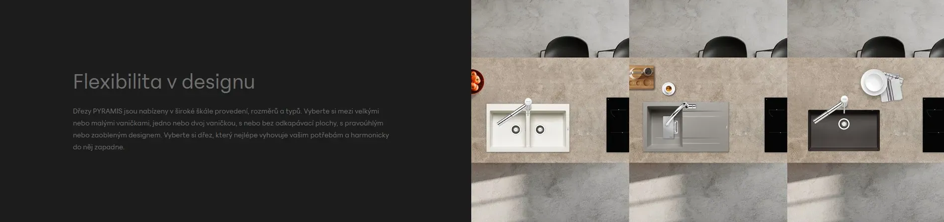 Dřezy PYRAMIS jsou nabízeny v široké škále provedení, rozměrů a typů. Vyberte si mezi velkými nebo malými vaničkami, jedno nebo dvoj vaničkou, s nebo bez odkapávací plochy, s pravoúhlým nebo zaobleným designem. Vyberte si dřez, který nejlépe vyhovuje vašim potřebám a harmonicky do něj zapadne.
