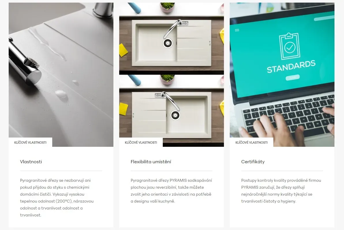 Pyragranitové dřezy se nezbarvují ani pokud přijdou do styku s chemickými domácími čističi. Vykazují vysokou tepelnou odolnost (200°C), nárazovou odolnost a trvanlivost odolnost a trvanlivost.