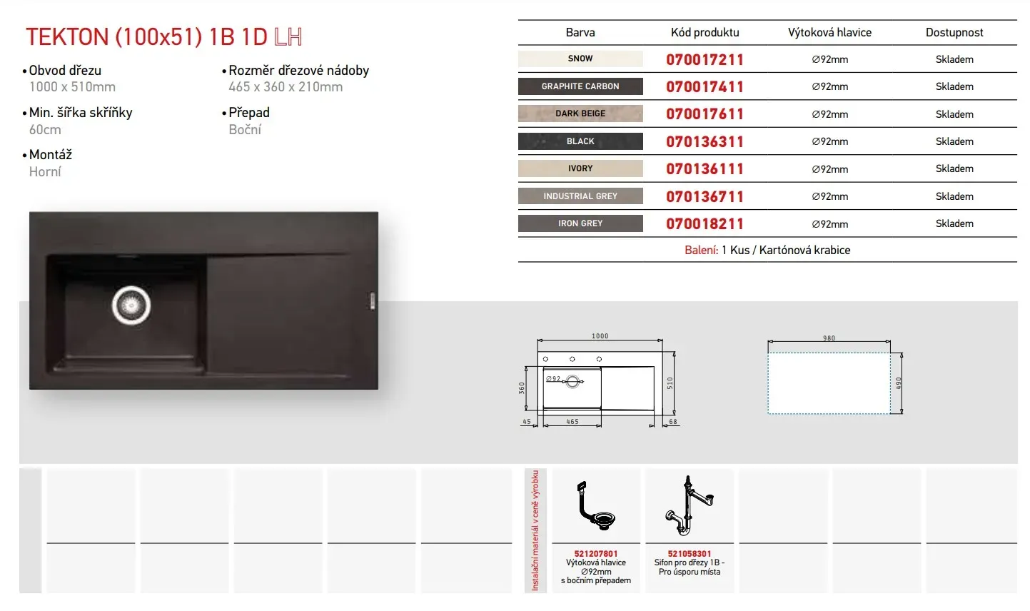 PYRAGRANITE TEKTON (100X51) 1B 1D LH BLACK Složení & Barvy Dřezy Pyragranite tvoří z 80% přírodní žula (silica), zbývajících 20% tvoří směs pryskyřic a jiných látek, které fungují jako pojivo. Můžeš najít dřezy PYRAMIS Pyragranite v 8 různých barvách: Snow, Graphite…