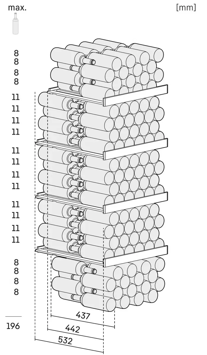 Promyšlené a propracované. Elegantní police vyrobené z bukového dřeva jsou navrženy pro vodorovné uložení vín bez působení vibrací a díky ergonomickému tvaru lze láhve snadno zasouvat, vytahovat i přeskládat. Další výhodou je skutečnost, že dřevo dýchá a dokáže uložit menší množství vody, což je dobré pro mikroklima uvnitř a tedy i pro dlouhodobé skladování.