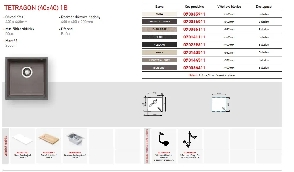 PYRAGRANITE TETRAGON (40X40) 1B Dřezové Nádoby    1 Poloha dřezové nádoby nereversibilní Odtok Výtoková hlavice průměr 92 mm Sířka skříňky    50 cm Typy Montáže    Spodní montáž Přepad boční Rozměr dřezové nádoby    440x400x200…