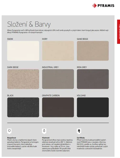 CertifikátyPostupy kontroly kvality prováděné firmou PYRAMIS zaručují, že dřezy splňují nejnáročnější normy kvality týkající se trvanlivosti čistoty a hygieny.