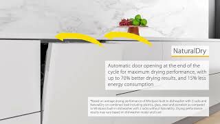 *Na základě průměrného sušicího výkonu a odpovídající spotřeby energie vestavné myčky nádobí Whirlpool se 2 zásuvkami a funkcí NaturalDry pro kombinovanou náplň zahrnující plasty, sklo, ocel a porcelán ve srovnání s vestavnou myčkou nádobí Whirlpool se 2 zásuvkami bez funkce NaturalDry. Výsledky sušení se mohou lišit v závislosti na modelu myčky a náplni.