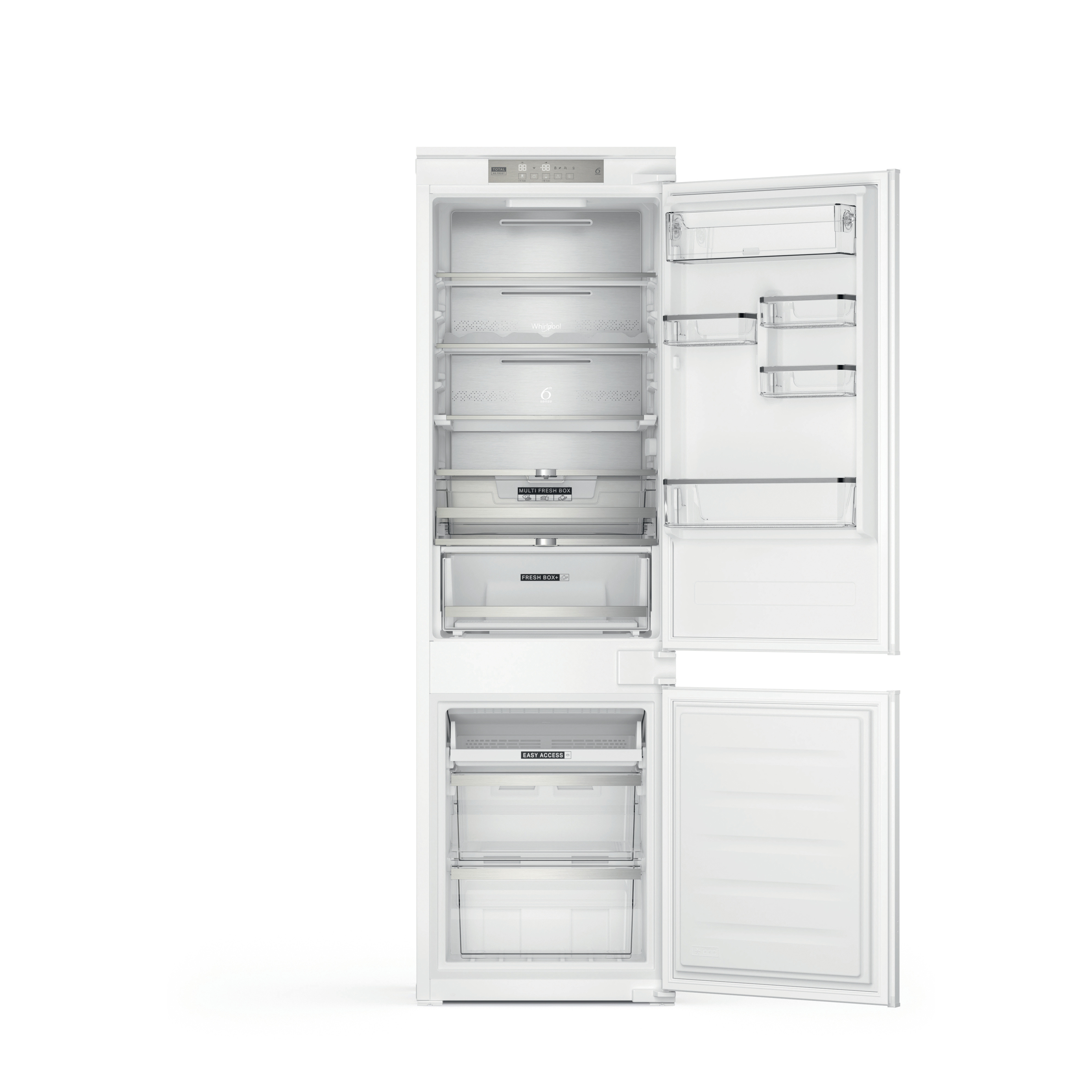 Přednosti této vestavné kombinované chladničky Whirlpool: bílá barva. Skleněné police, které poskytují pevnost i eleganci. Ventilátor, který zajišťuje plynulé a rovnoměrné proudění vzduchu v prostoru spotřebiče pro doonalou cirkulaci vzduchu. Senzory 6. SMYSL, které automaticky snižují teplotu uvnitř spotřebiče po přidání nových potravin, čímž snižují spotřebu energie. Robustní přihrádka na lahve pro bezpečné uložení lahví.