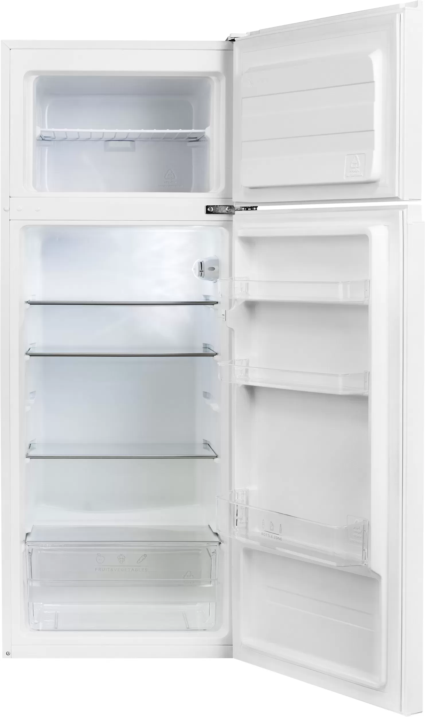 Model je vybaven vnitřním LED osvětlením, dveřními poličkami, skleněnými poličkami v hlavní části a šuplíkem na ovoce a zeleninu.