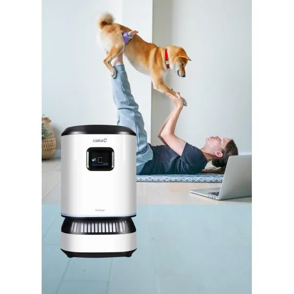 Certifikovaná čistička proti COVIDU – CATA Purifyer NONVIRAIR®. Antivirová čistička vzduchu, která likviduje veškeré viry, bakterie a nečistoty, dezinfikuje povrchy. Na čištění prostor do 60 m² (velké pokoje, kanceláře, čekárny, menší ordinace a podobné prostory). NONVIRAIR – Technologie jedinečná způsobem, jakým ničí veškeré nečistoty, včetně virů, jako je například SARS-COV-2 (COVID-19). Působením vysokoenergetických částic mění stav hmoty a tím přeměňuje molekuly ve vzduchu. Samostatná diagnostika + barevné podsvícení podle kvality okolního vzduchu. Longlife filtry HEPA H13 vyvinuté NASA na ochranu astronautů před nebezpečnými částicemi. Možnost automatického režimu, ručního nastavení nebo ovládání pomocí mobilní aplikace přes BlueTooth. 99,99% účinnost při likvidaci virů, bakterií, jedovatých plynů nebo např. alergenů. Program STERILIZACE, ve kterém se nečistí pouze okolní ovzduší, ale také veškeré povrchy či oblečení, ve dvou módech. Devítihodinový nebo intenzivní hodinový, prováděný bez přítomnosti osob. Speciálně testována na likvidaci koronaviru. Certifikace účinnosti – UPC, Certifikace provozní bezpečnosti – VDE, Certifikace elektrické bezpečnosti a EMC kompatibility – Applus.