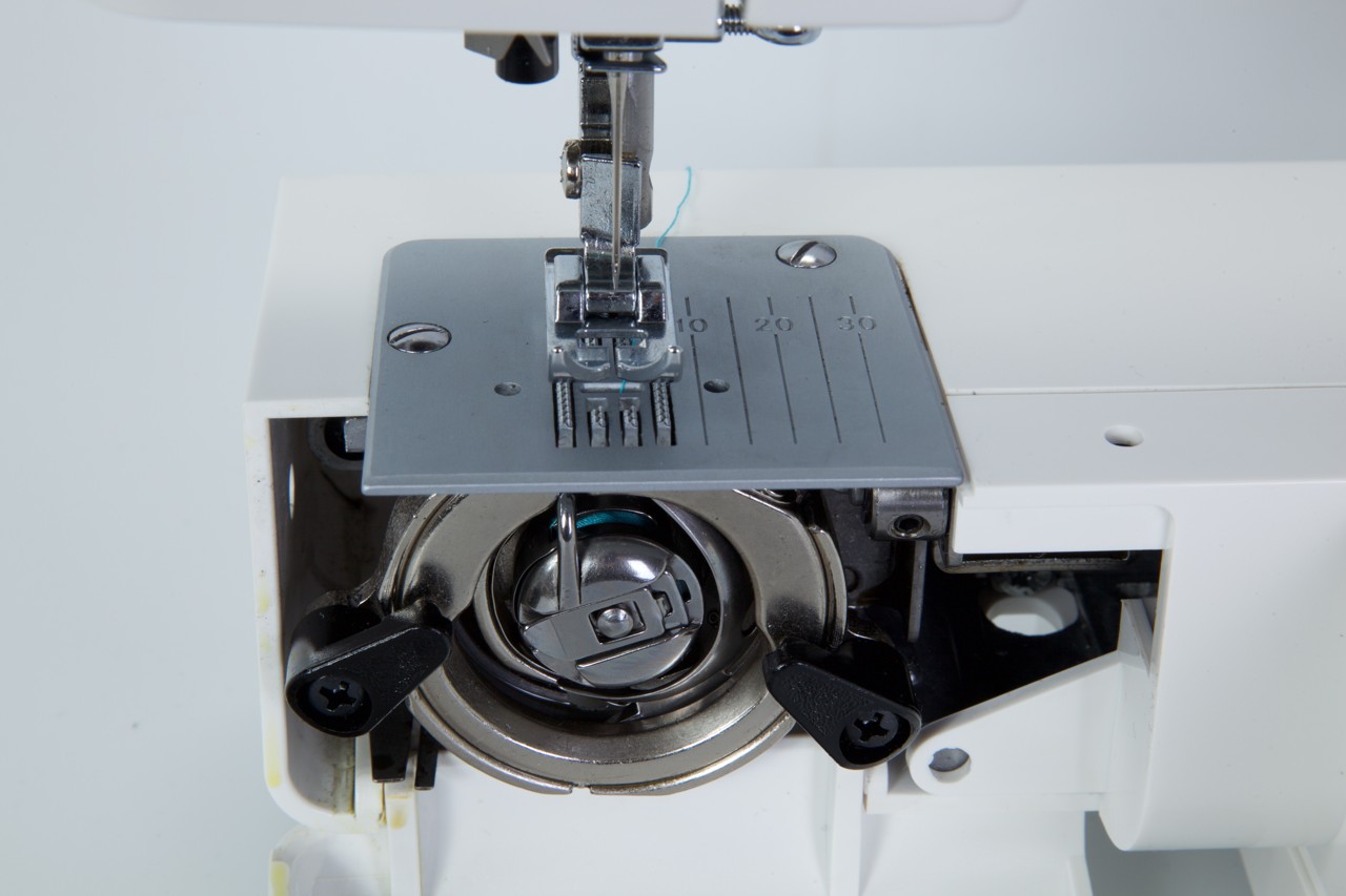 velký kryt volného ramene rozšiřující pracovní plochu a zvyšující pohodlí při šití zejména náročných materiálů, s vnitřní velkou schránkou na příslušenství