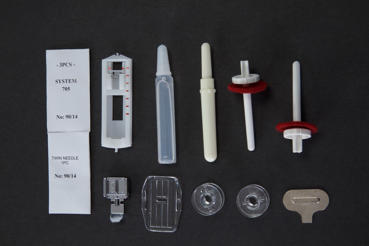 připravenost stroje pro šití dvojjehlou – již základní výbava zahrnuje jak kolík dvojjehly, tak i dvojjehlu. Stále oblíbenější šití dvojjehlou se používá na dekorativní šití a především půvabné vyšívání barevně zajímavých vzorů.