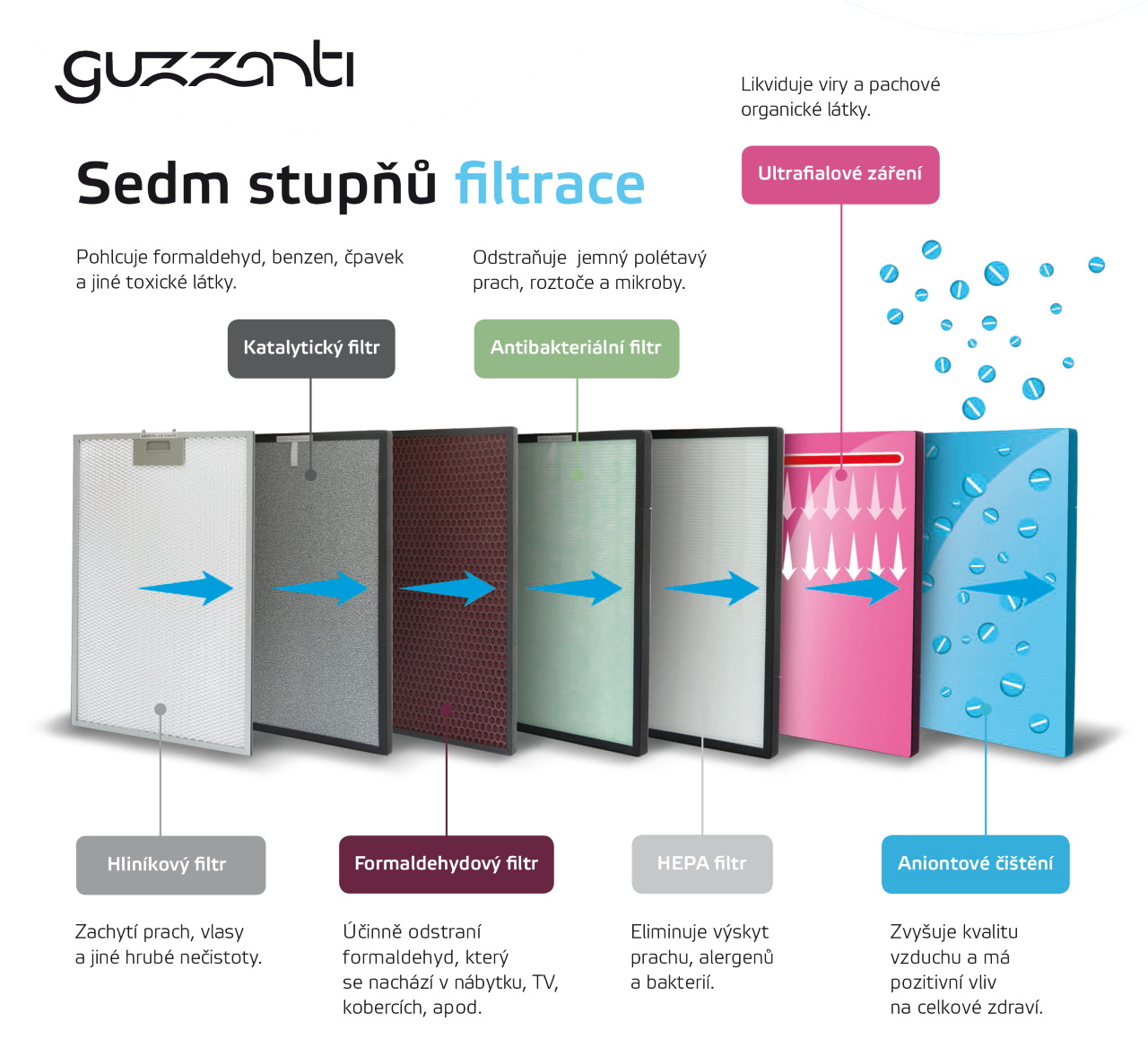 Katalytický filtr – pohlcuje formaldehyd, benzen, čpavek, TVOC, sirovodík a další nebezpečné plyny uvolňující se z nábytku, tapet, koberců či záclon.
