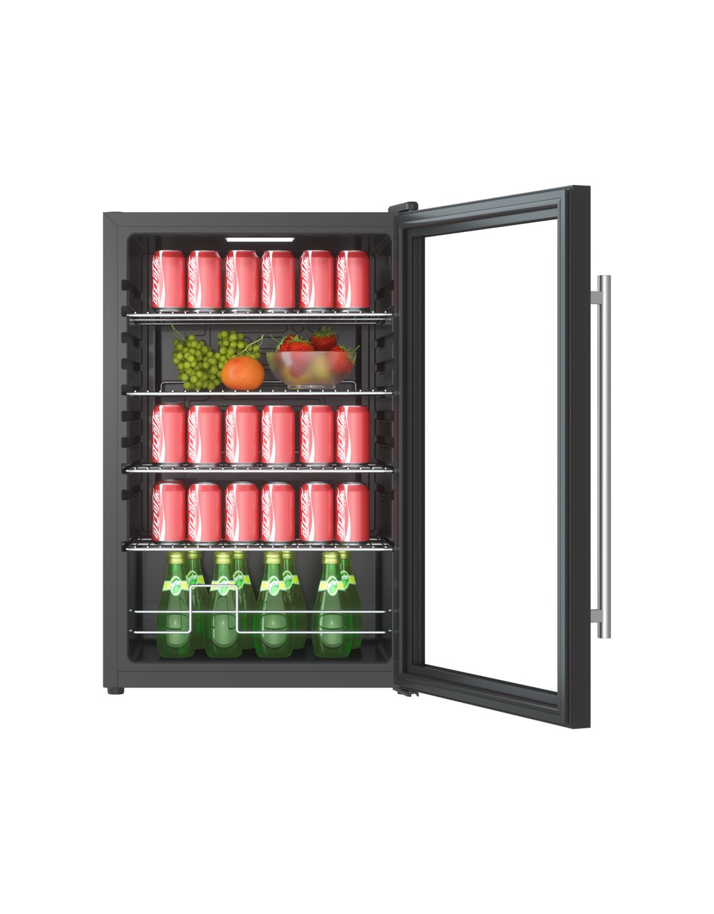 Vitrína nabízí celkový objem 115 l s temperovaným sklem. Směr otevírání dveří vitríny lze snadno měnit a police jsou nastavitelné. Nastavitelná teplota chlazení už od 3°C