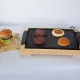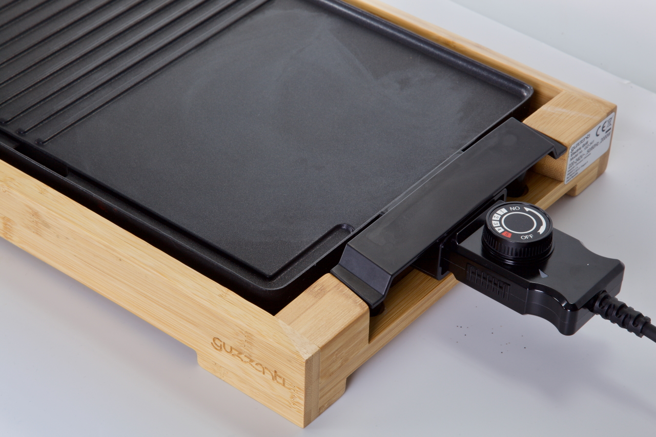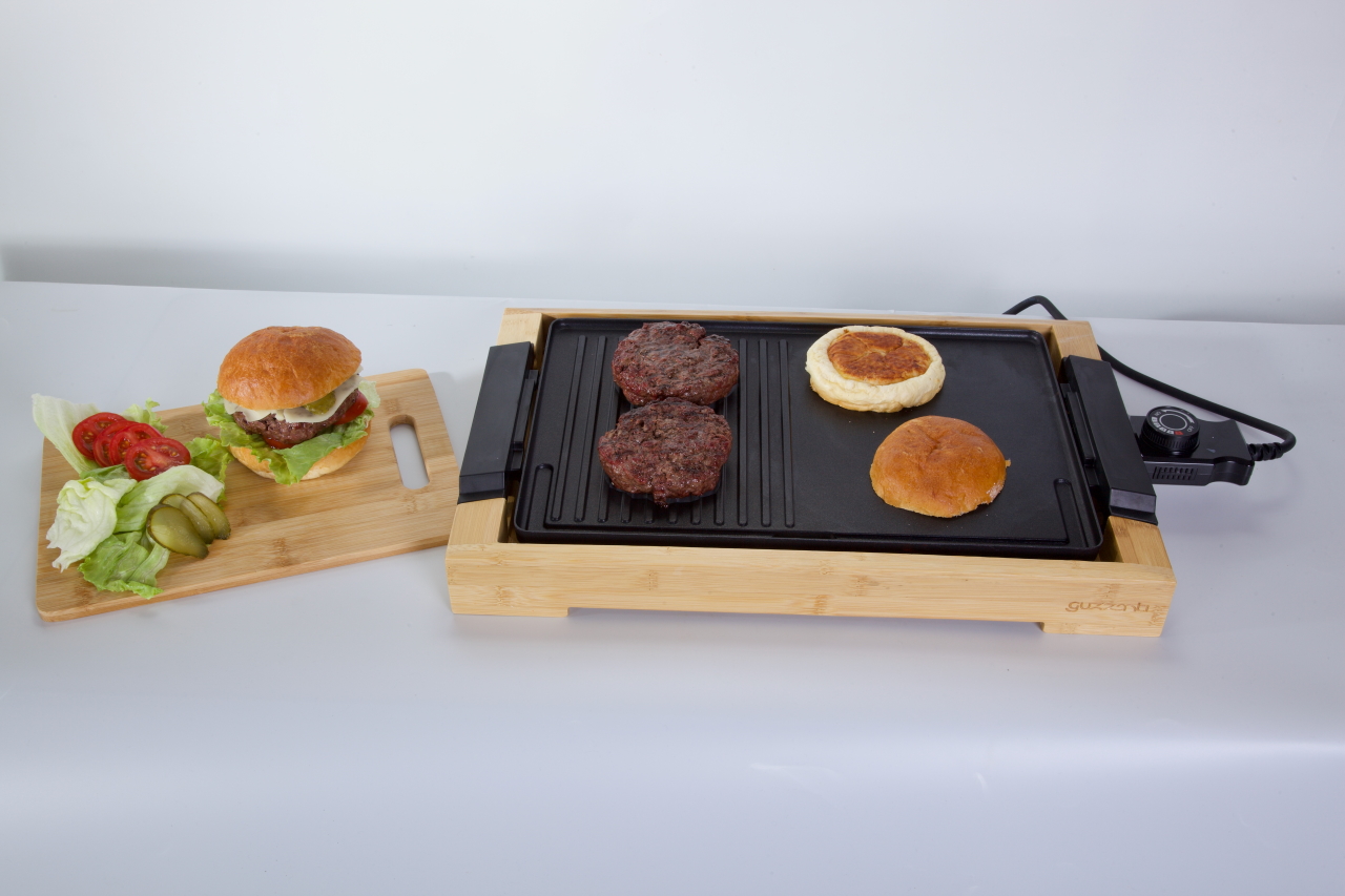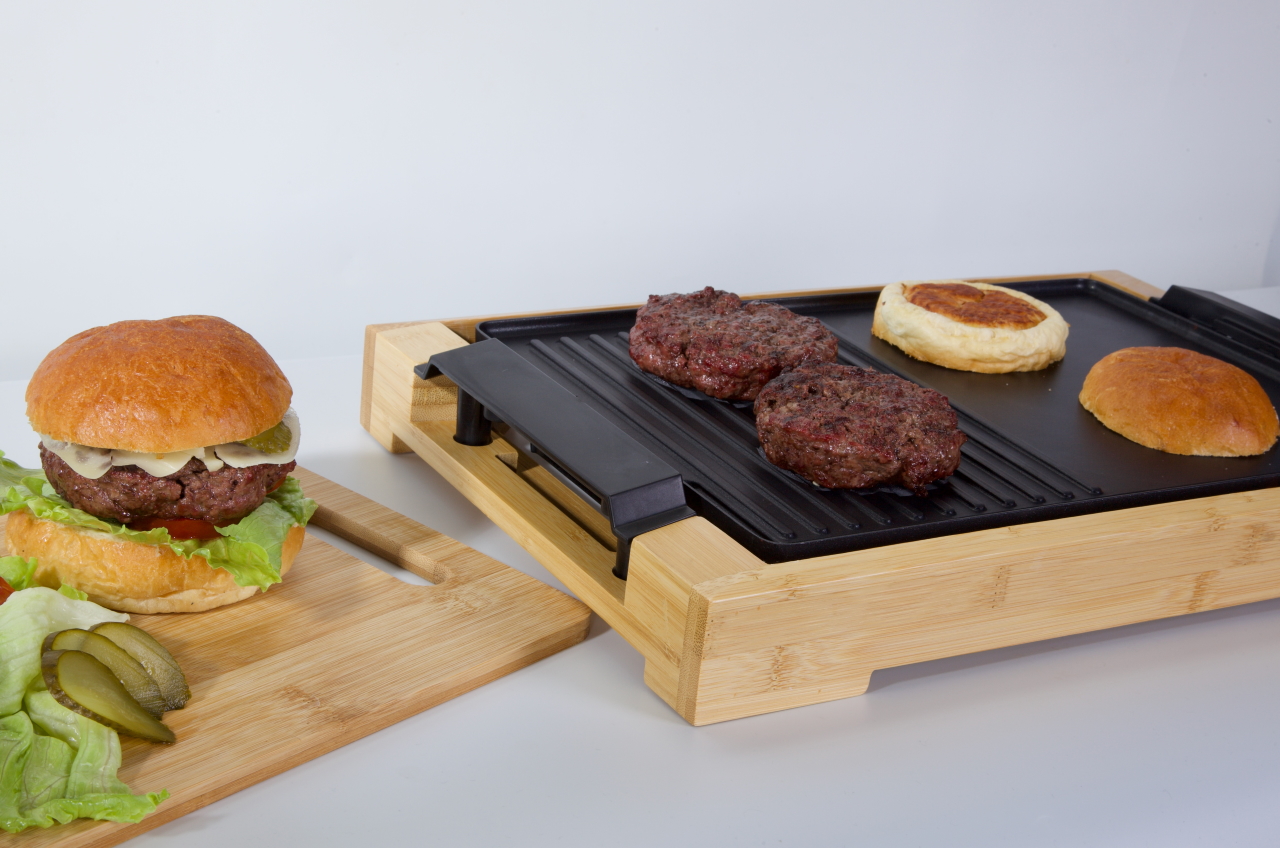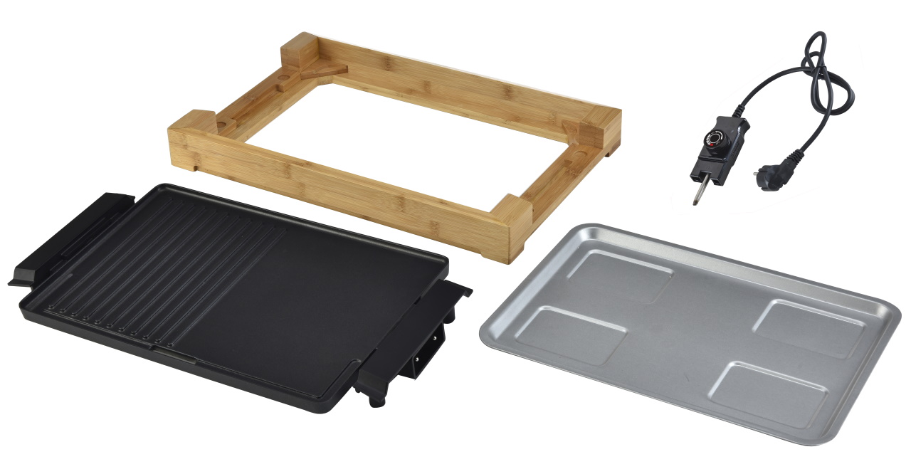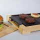grilovací deska o rozměru 37,5 x 25 cm je uložena v rámu z bambusového dřeva