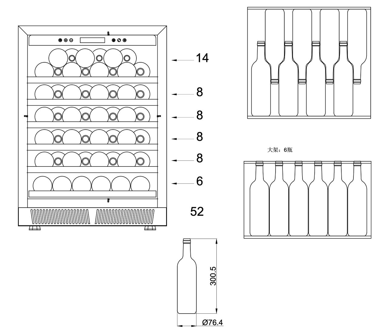 Možnost uskladnění až 52 lahví vína (145 l)