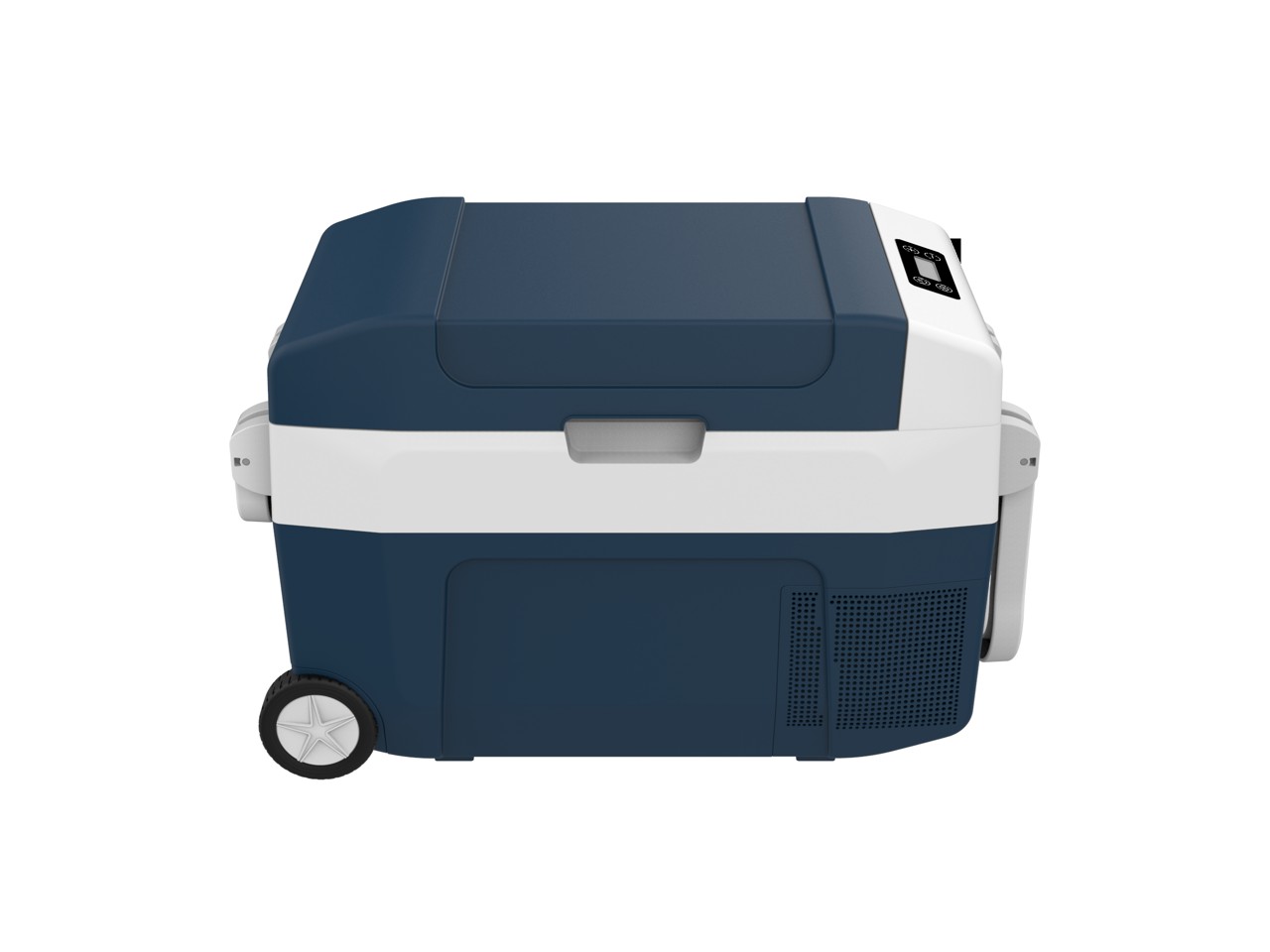 Chladící box rodinné velikosti vybavený kolečky a madlem