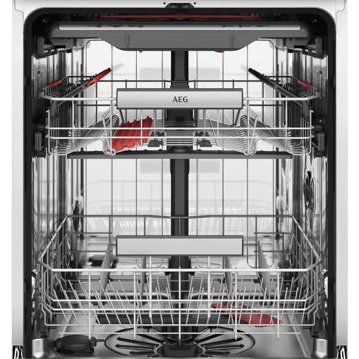- Horní košík má 2 skládací držáky, 2 skládací drátěné držáky pro skleničky, 2 měkké špičky, 6 měkkých špiček pro vinné sklenky, skládací poličky na šálky, nerezové držadlo AEG, boční úchyty koše