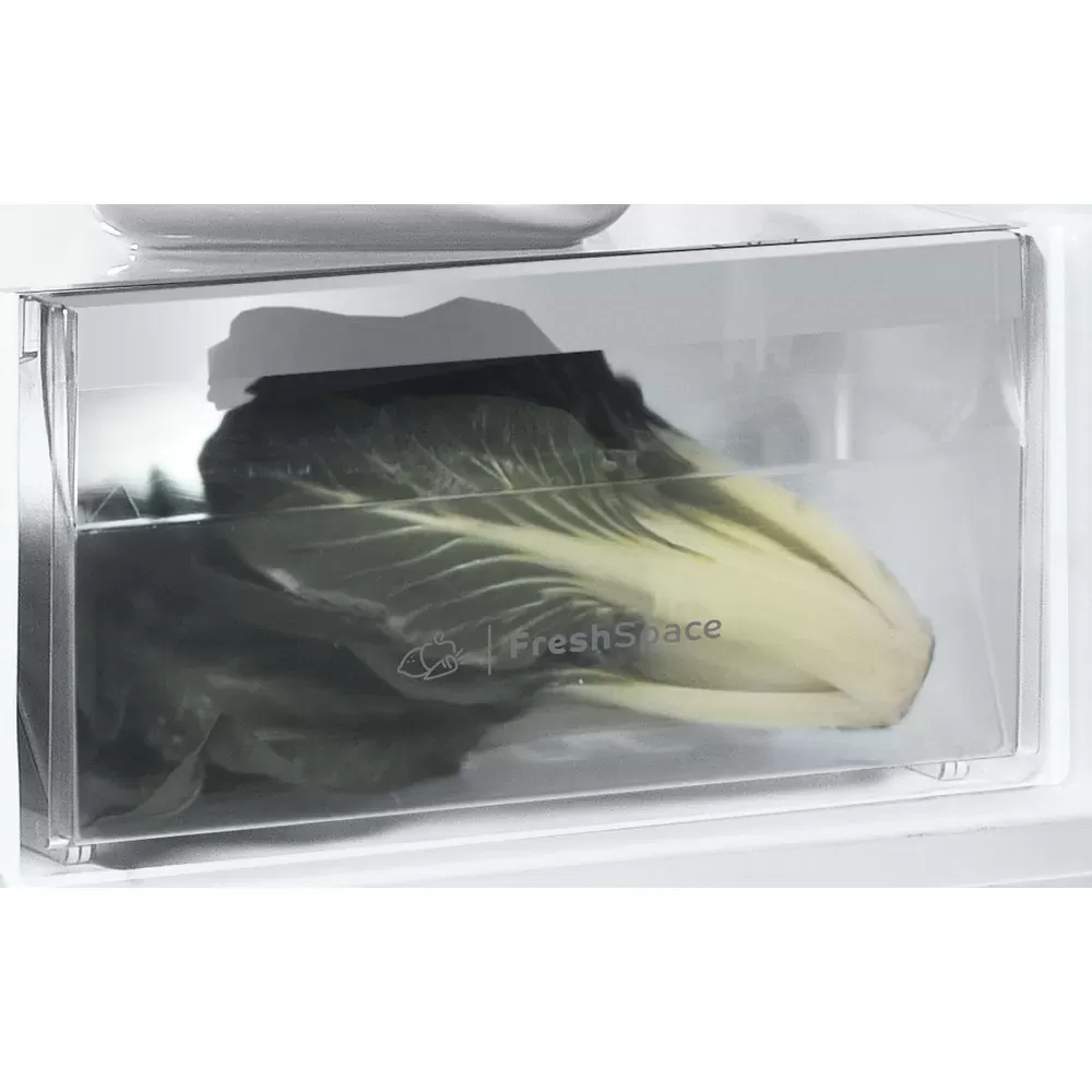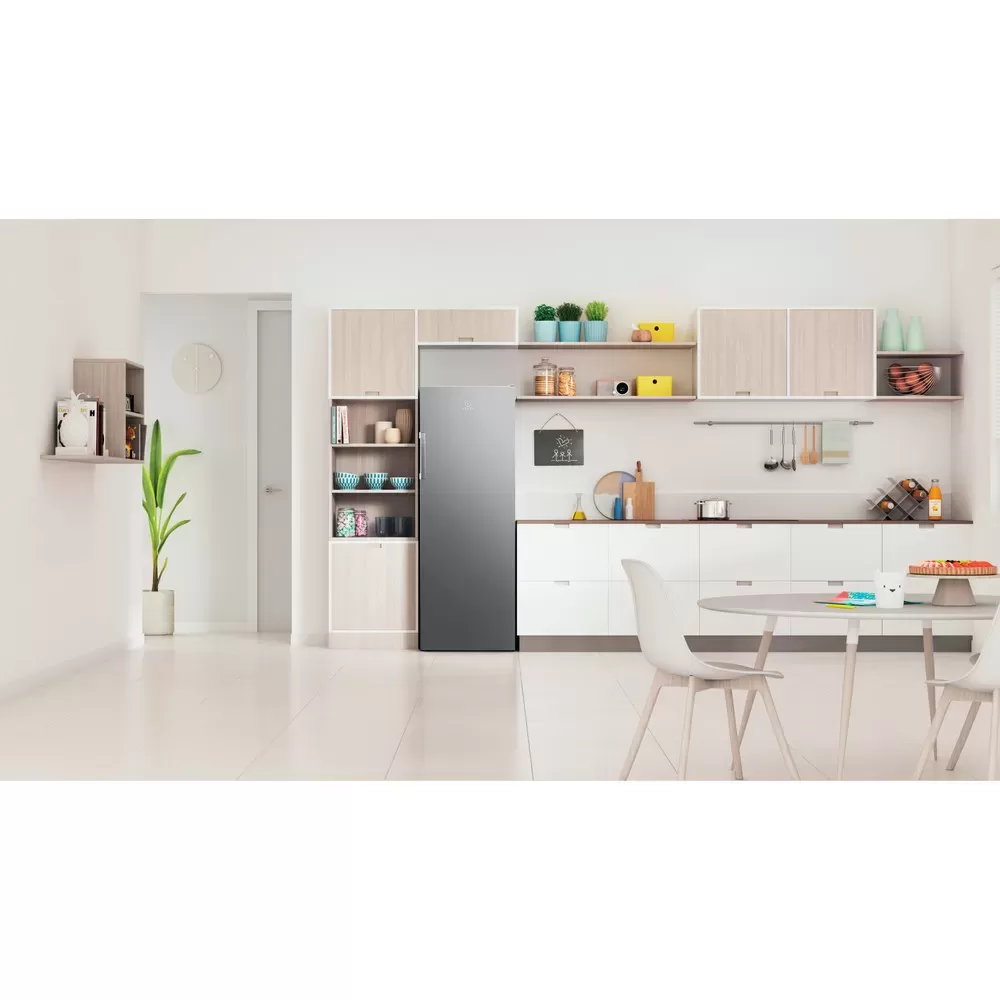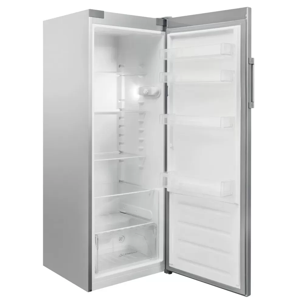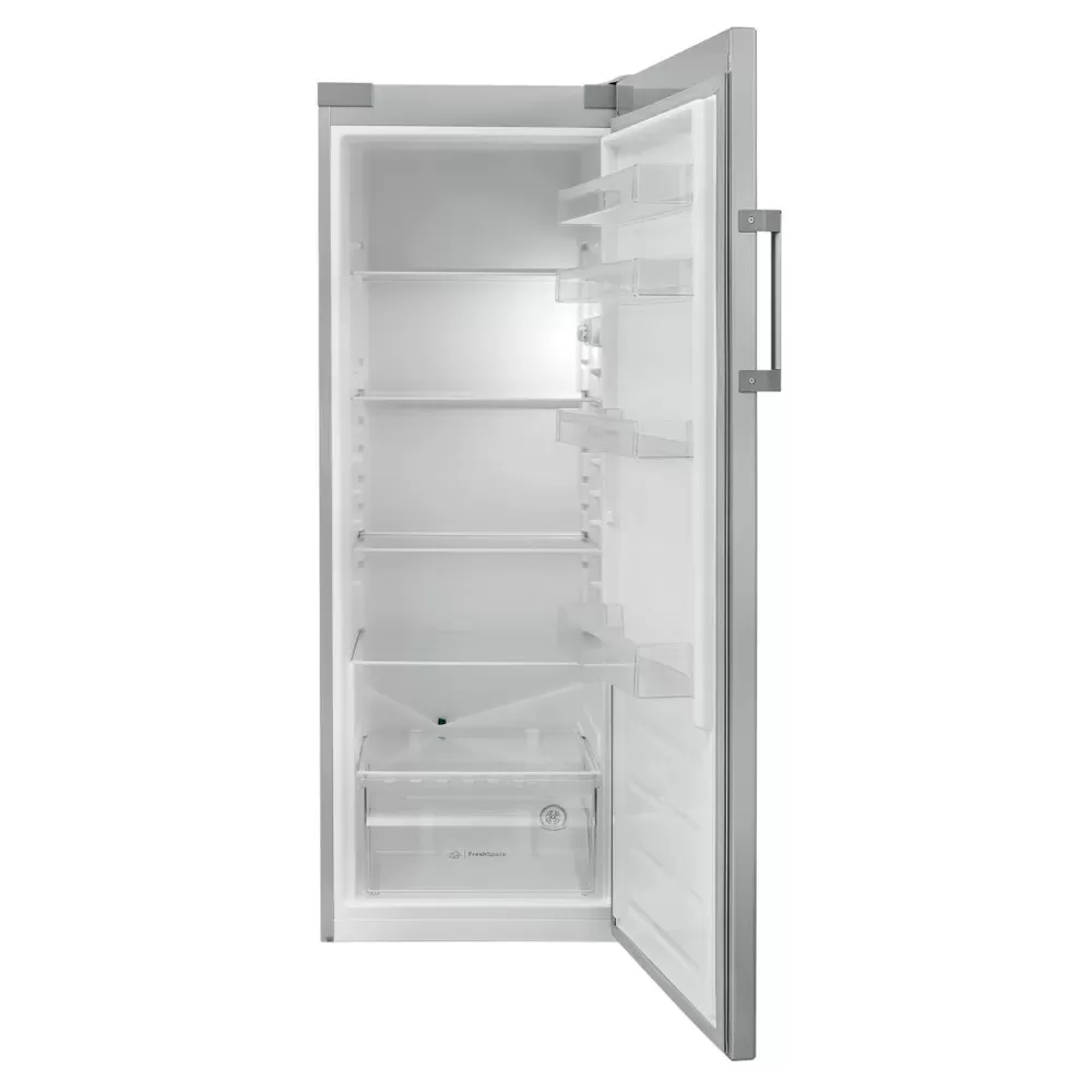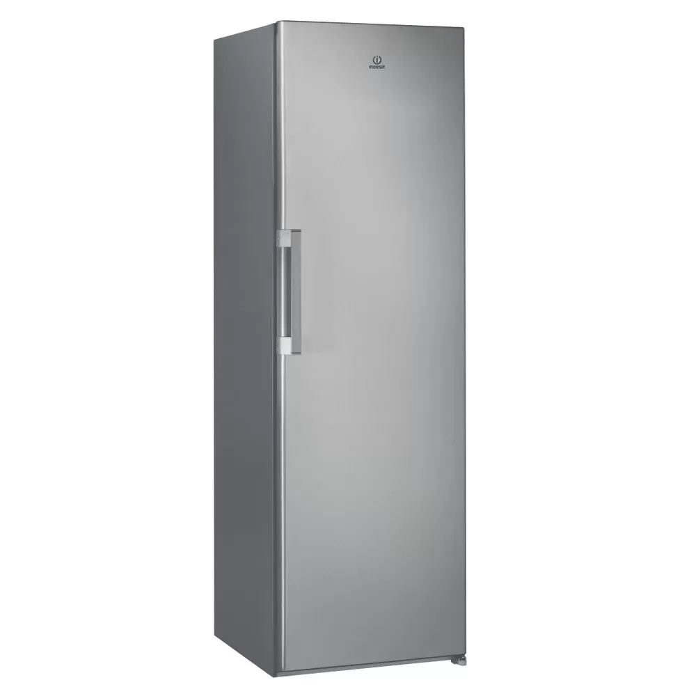Tato volně stojící chladnička Indesit nabízí: prostor určený k uložení lahví. Stříbrný design.