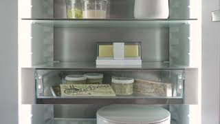 Chcete dát do chladničky velkou nádobu? Pak si jednoduše upravte výšky zasunutí skleněných desek. Díky komfortnímu nastavení výšky to lze provést rychle a přesně podle vašich potřeb – dokonce i s potravinami uloženými na deskách.