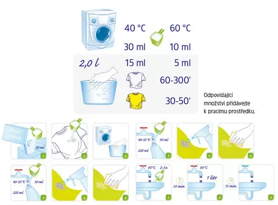 Přidejte k pracímu prášku do hlavního praní podle dávkovací tabulky.