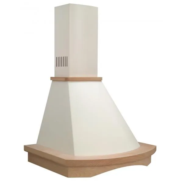 Rustikální komínová digestoř, šíře 60 cm, bílá / nemořená buková lišta, max. výkon 297 m³/h (15 Pa), hlučnost Lw 51 – 61 dB(A), 3 rychlosti, odsávací jednotky mají individuálně vyvažovanou turbínu, motory jsou opatřené vratnými tepelnými pojistkami (při přetížení motoru vypne, po jeho vychladnutí opět sepne), mechanické posuvné ovládání, kovové sendvičové tukové filtry, které lze mýt v myčce, možnost práce v odtahovém i recirkulačním režimu, výstupní průměr 120 mm, Výbava: úsporné LED osvětlení 2 × 2 W, zdarma zpětná klapka, Benefity: nemořená dřevěná lišta umožňuje individuální barevné doladění třeba podle materiálu kuchyně