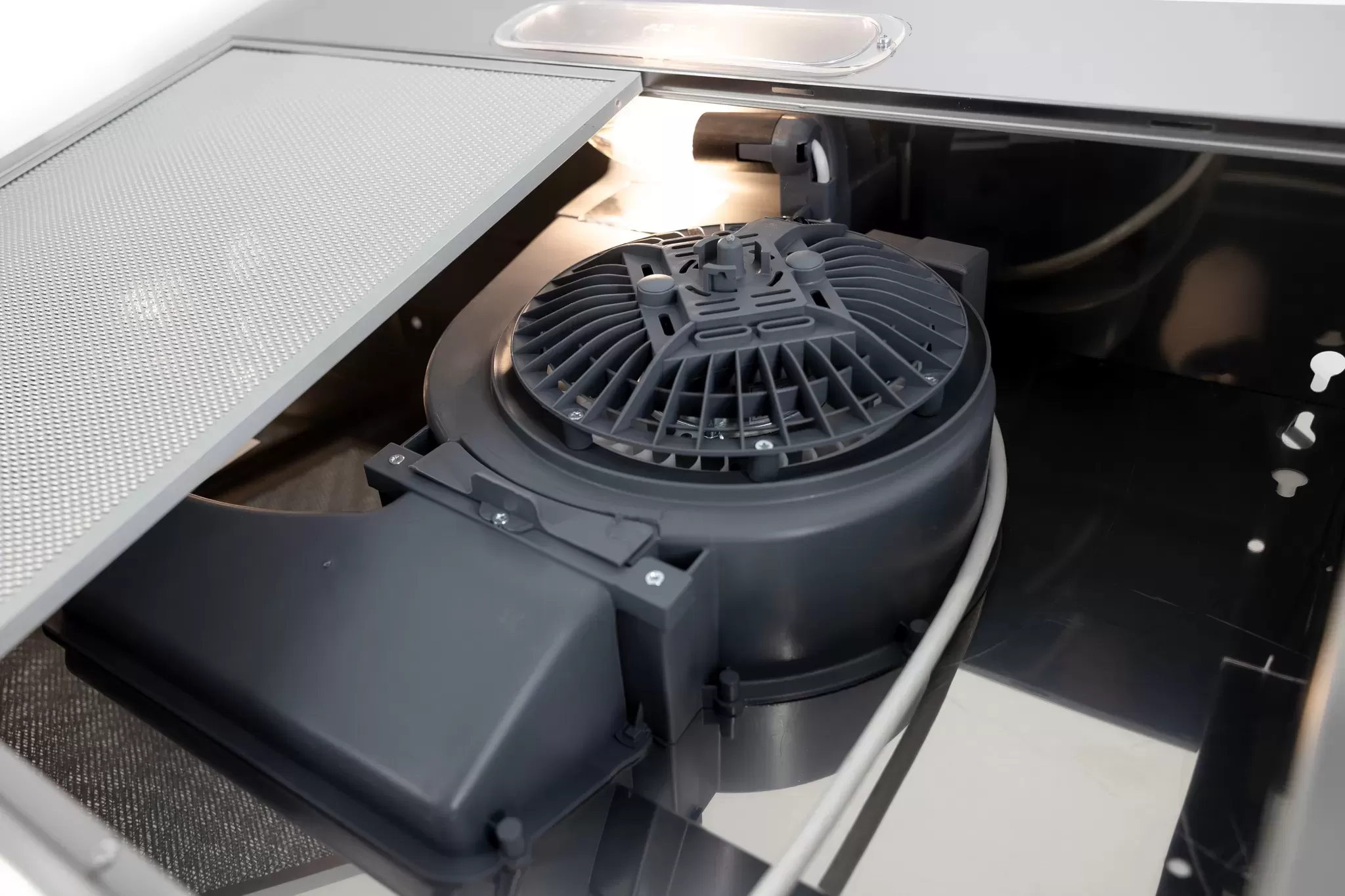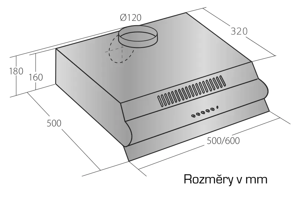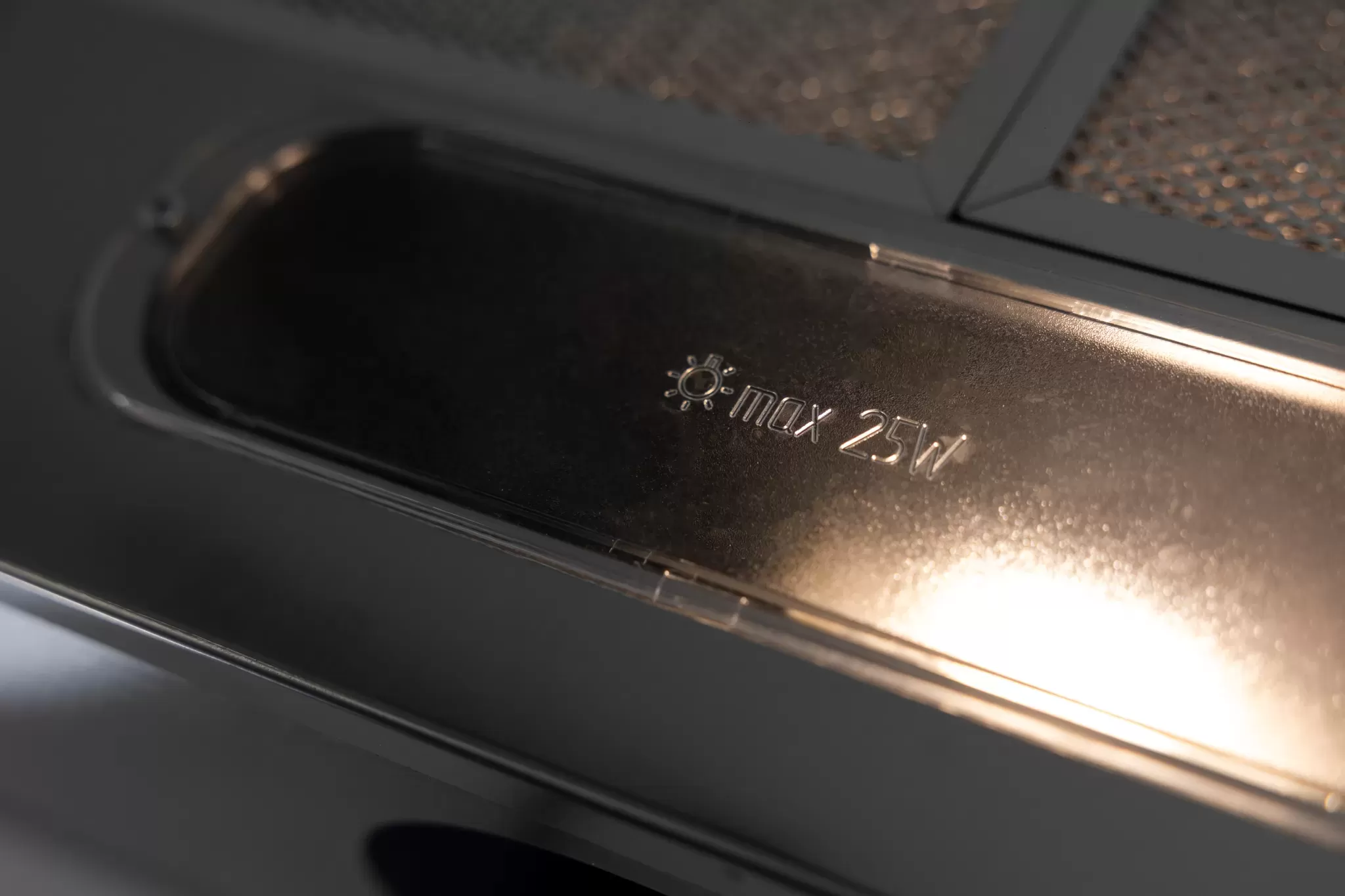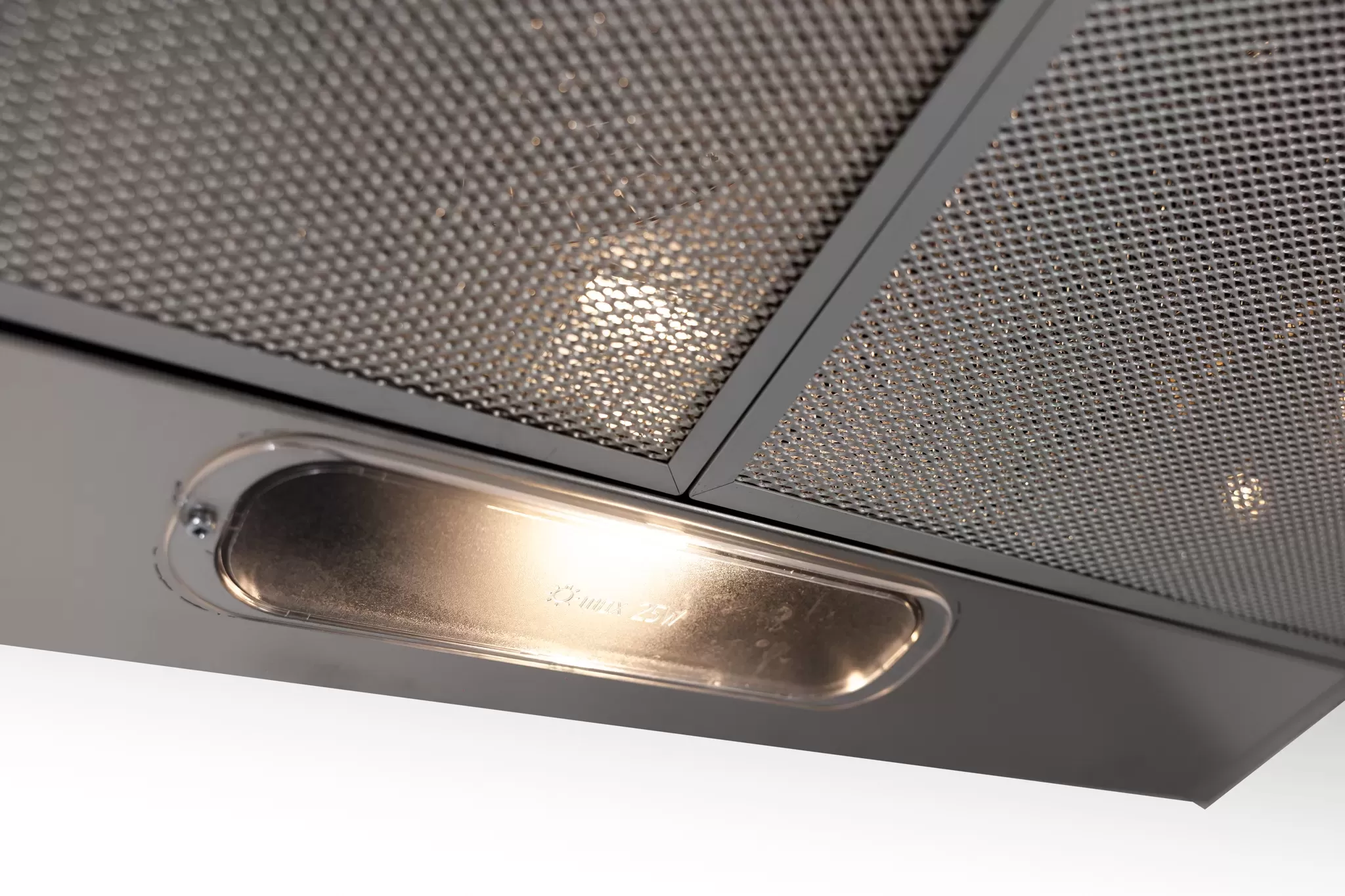 Podskříňková digestoř, šíře 50 cm,nerez, max. výkon 160 m³/h (15 Pa), hlučnost Lw 50 – 61 dB(A), 3 rychlosti, mechanické tlačítkové ovládání, kovové sendvičové tukové filtry, které lze mýt v myčce, možnost práce v odtahovém i recirkulačním režimu, výstupní průměr 120 mm, osvětlení 1 × 4 W LED žárovka E14, Výbava: zdarma zpětná klapka