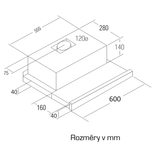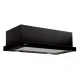 Vestavná výsuvná, 600 mm, černá s černým sklem na čelní liště, 1 motor 80 W, 2 rychlosti, 340 m3/h (15 Pa), max. tlak 194 Pa, max. hlučnost Lw 57 dB.