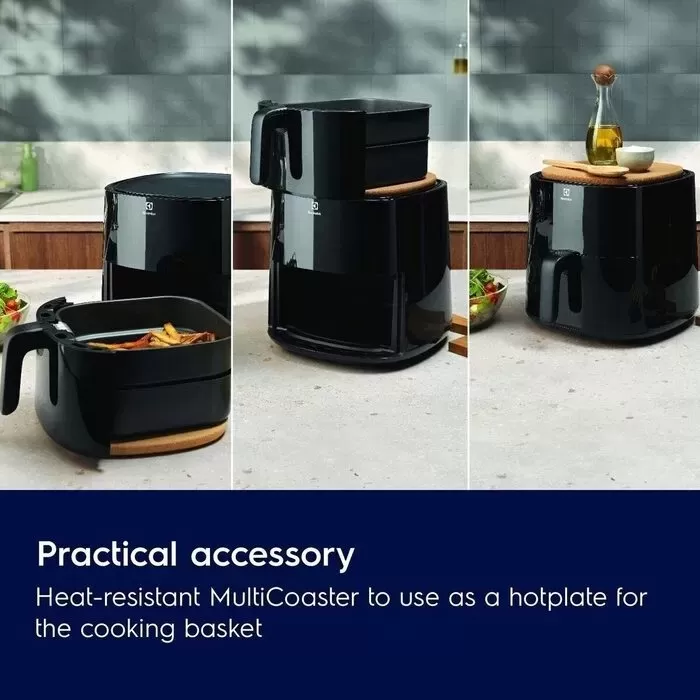 Univerzální podložka Multi Coaster slouží jako odkládací plotýnka pro koš fritézy, kuchyňské pomůcky nebo koření, a šetří tak prostor na kuchyňské lince. Je také vyjímatelná a lze ji použít u stolu při servírování jídla přímo z horkého koše.