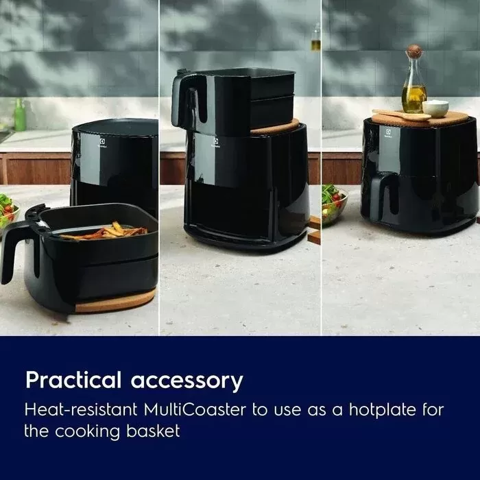 Univerzální podložka Multi Coaster slouží jako odkládací plotýnka pro koš fritézy, kuchyňské pomůcky nebo koření, a šetří tak prostror na kuchyňské lince. Je také vyjímatelná a lze ji použít u stolu při servírování jídla přímo z horkého koše.