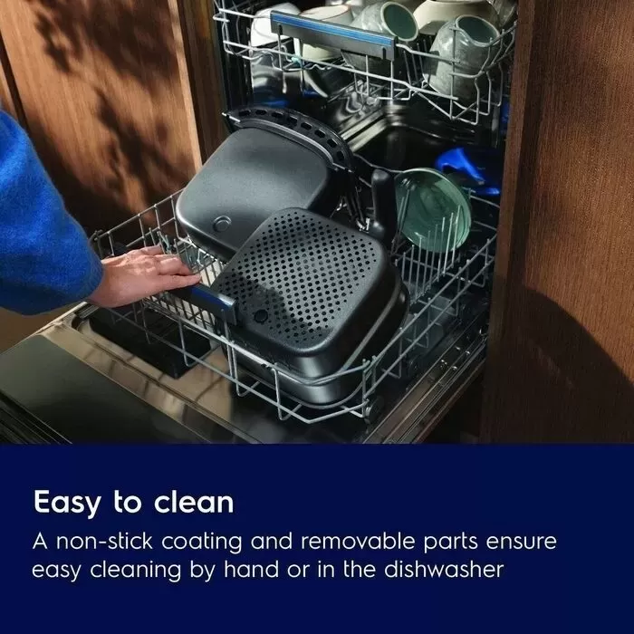 Horkovzdušná fritéza 700 má nepřilnavý povrch, který umožňuje po přípravě jídla rychlé a snadné čištění. Můžete ji umýt ručně nebo odnímatelné části jednoduše vložit do myčky nádobí.