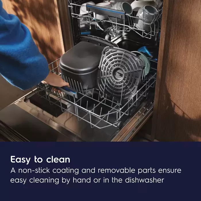 Horkovzdušná fritéza 800 s funkcí páry má nepřilnavý povrch, který umožňuje po přípravě jídla rychlé a snadné čištění. Můžete ji vyčisti ručně nebo odnímatelné části jednoduše vložit do myčky nádobí.