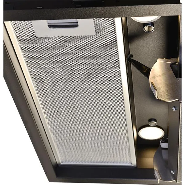 Neviditelná vestavná digestoř, 450 mm (pro 600 mm skříňku), nerez / černé sklo, přehledné a snadno přístupné dotykové (sensorové) ovládání na výklopném spodním panelu, 3 rychlosti, max. výkon 710 m³/h (5 Pa), hlučnost Lw 40 – 67 dB(A), max. tlak 450 Pa, 15 min. časovač, kovové sendvičové tukové filtry, které lze mýt v myčce, výstupní průměr 150 mm, možnost práce v odtahovém i recirkulačním režimu, snadná montáž, Výbava: úsporné LED osvětlení 2 × 4 W s nastavitelnou intenzitou jasu.