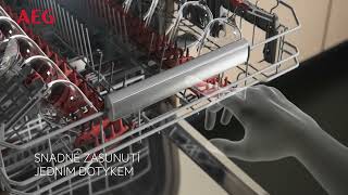 - Horní košík má 6 měkkých špiček pro vinné sklenky, 2 skládací držáky, 2 skládací drátěné držáky pro skleničky, 2 měkké špičky, skládací poličky na šálky, plastové madlo AEG, Premiové pojezdy