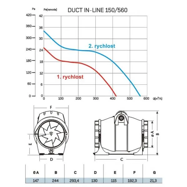Potrubní ventilátor radiální, pr. 150 mm, 420/560 m³/h, 31/39 dB(A), 26/36 mmH2O (255/353 Pa), IPX4