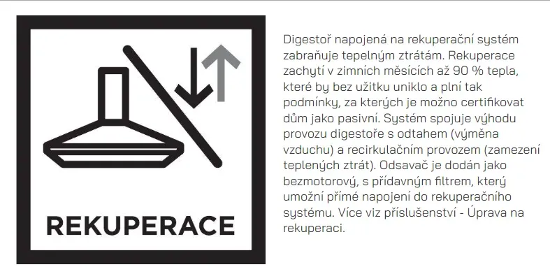 Unikátní je možnost úpravy digestoře pro přímé napojení do rekuperačního systému. Odsavač je v tomto případě dodáván bez motoru a je vybavený přídavným tukovým filtrem pro zachycení těch nejjemnějších mastných částic.