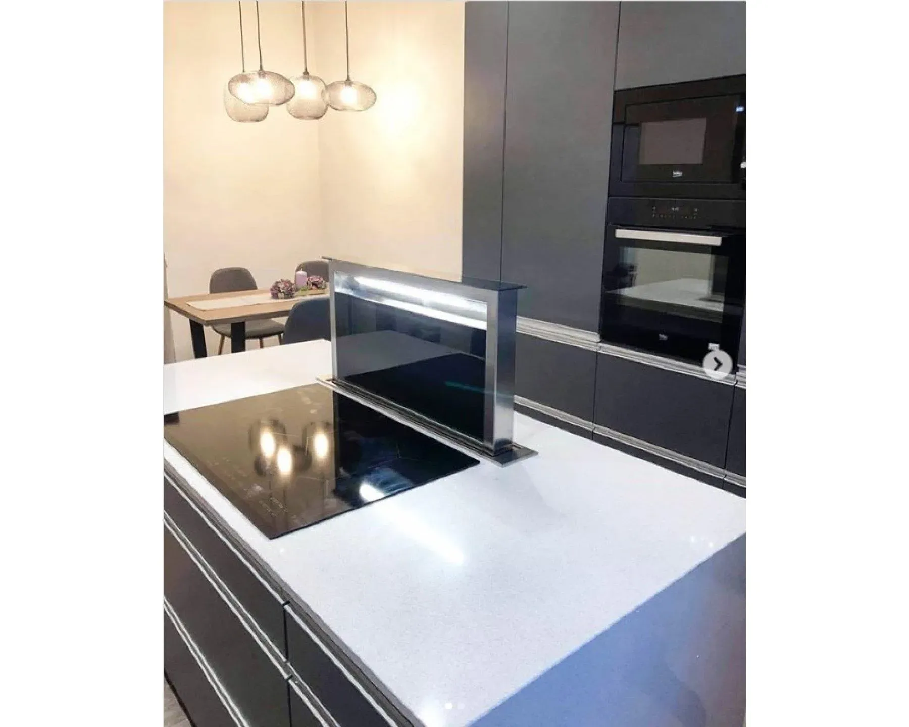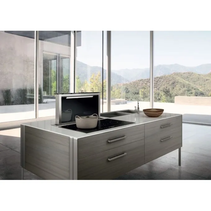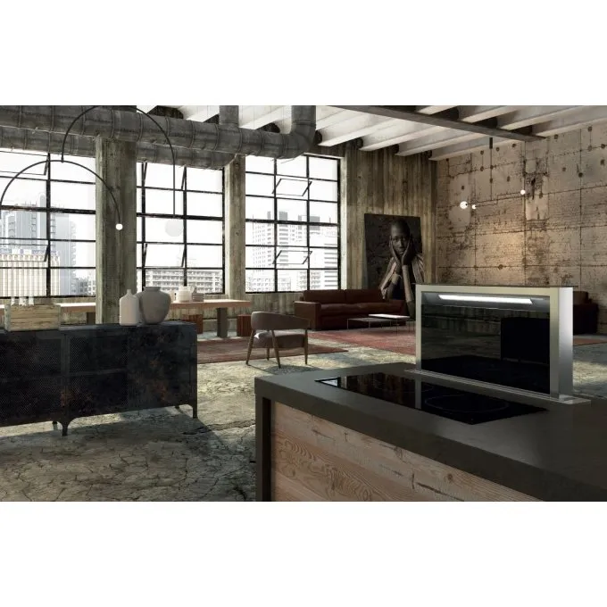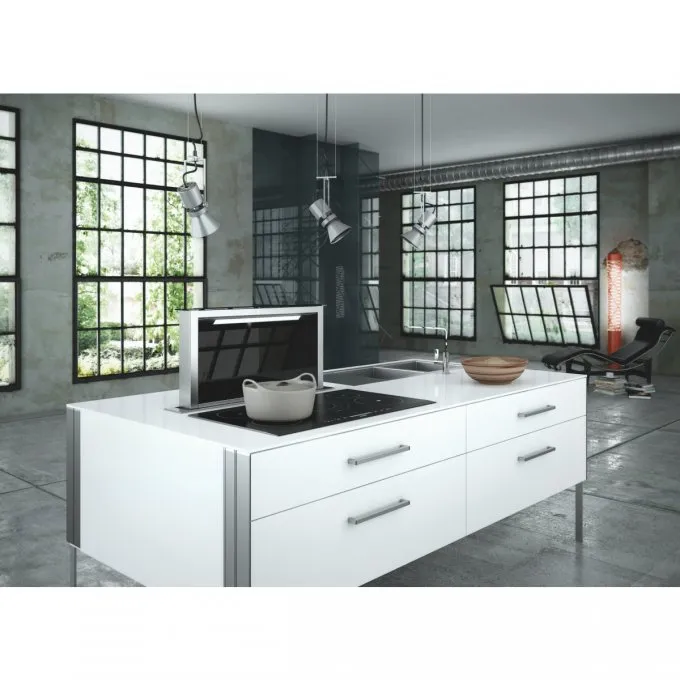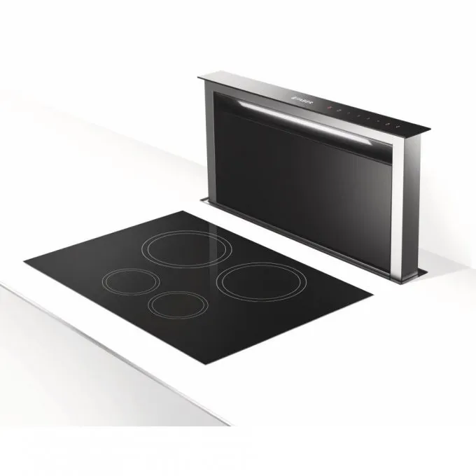 Je určena k instalaci přímo do pracovní desky za varnou plochu. Jakmile ji zapnete, vysune se z pracovní desky sací část a začne odsávat páry a pachy nejen z prostoru nad varnou deskou, ale rovnou z celé kuchyně.
